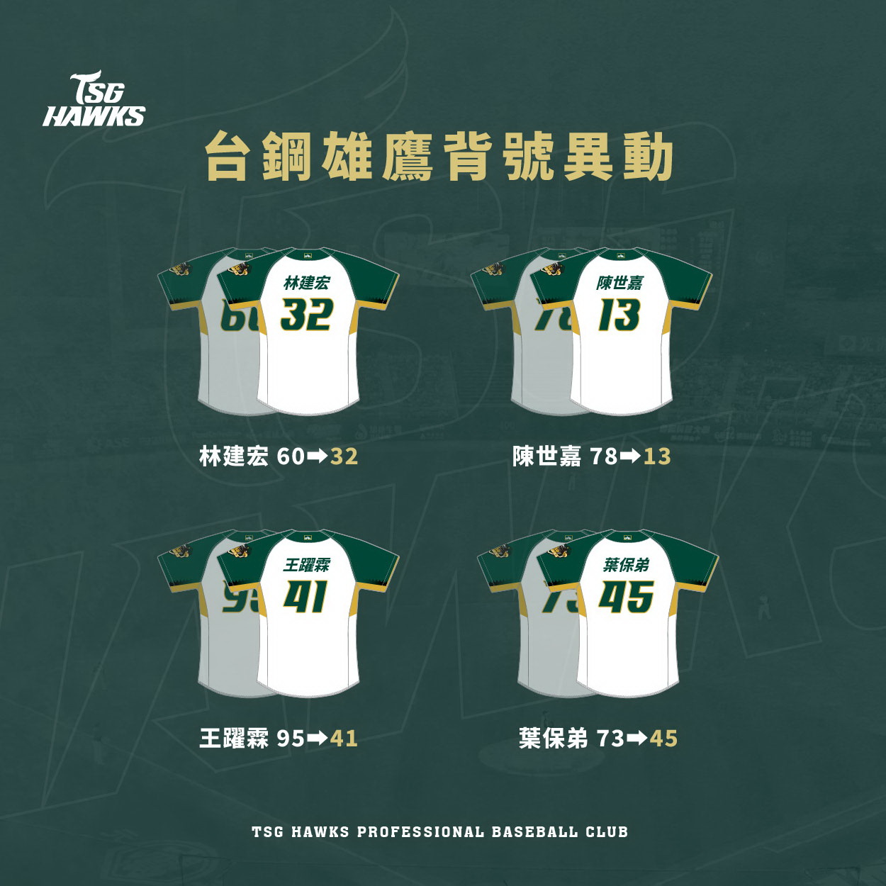 選手有4人背號異動,投手林建宏由60號改為32號、王躍霖由95號改為41號。