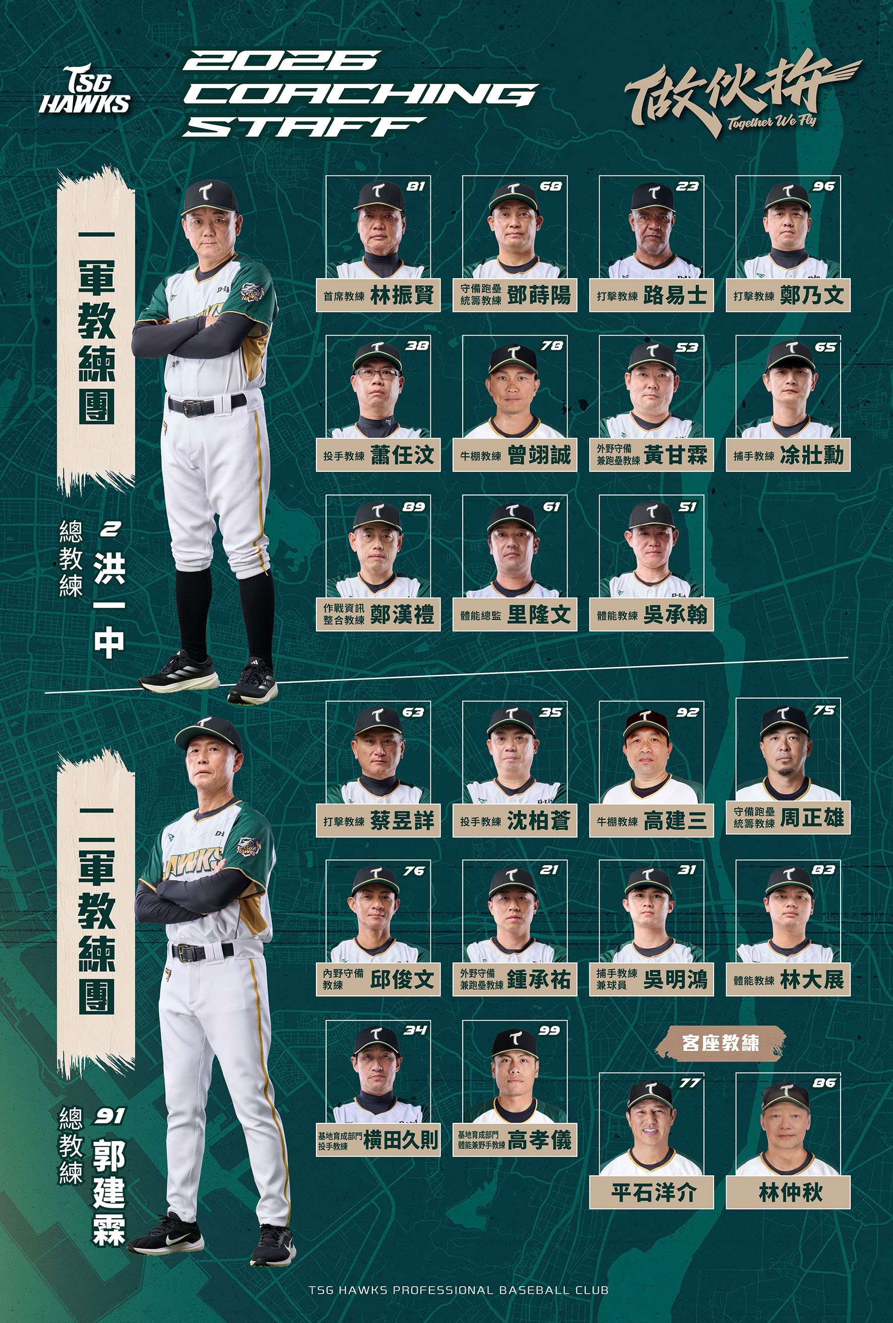 台鋼雄鷹2026球季教練團陣容底定,一軍部分,總教練洪一中,首席教練林振賢,守備跑壘統籌教練鄧蒔陽。