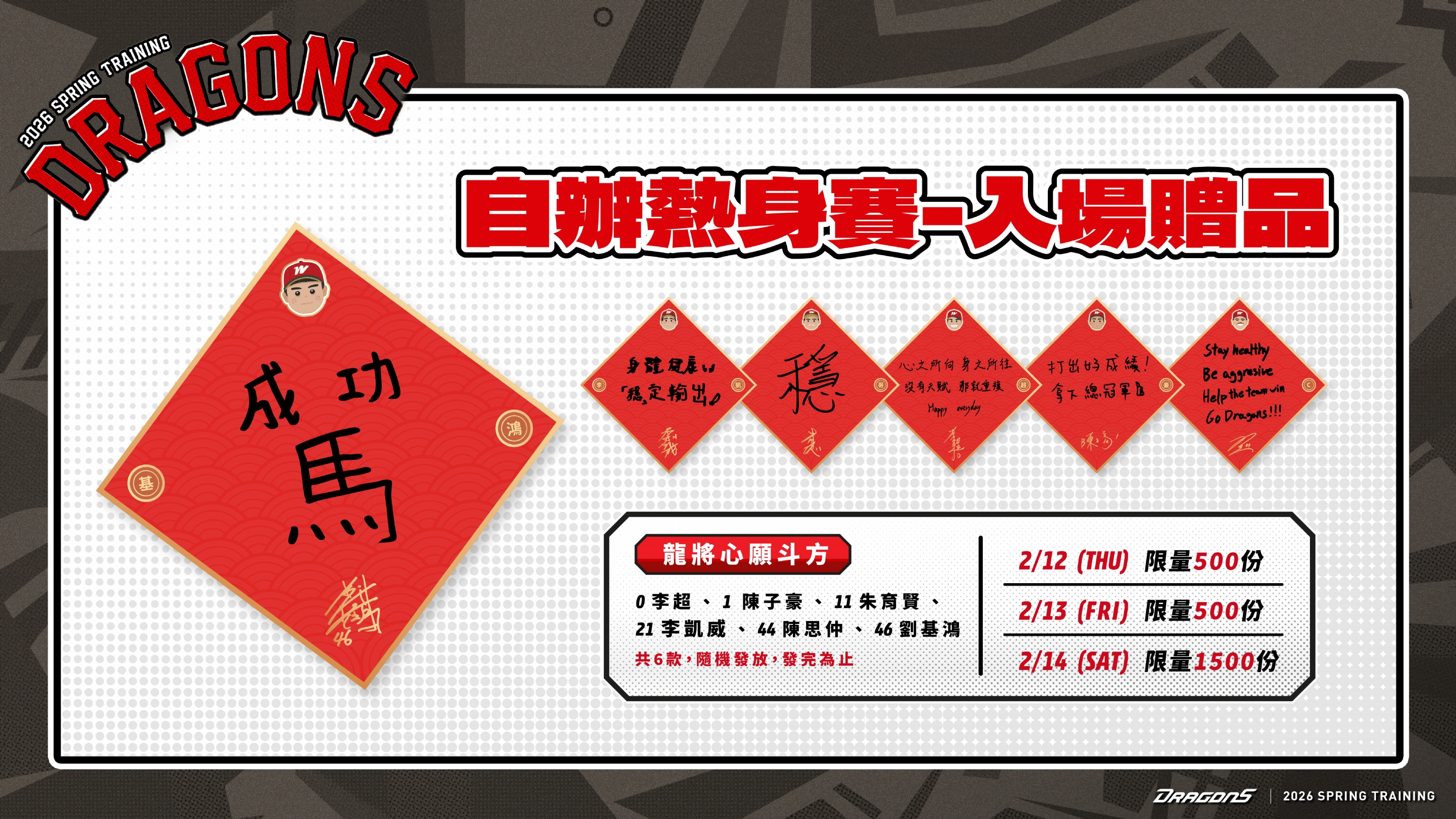 春節前場次(2/12-2/14)將發放「龍將心願斗方」共6款,包含李超、陳子豪、朱育賢、李凱威、陳思仲、劉基鴻款式。