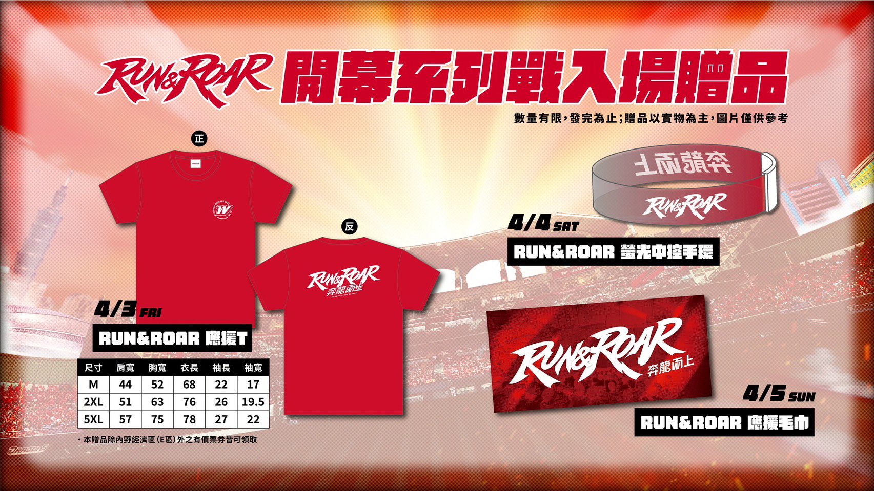 包含4月3日贈送的「Run & Roar 應援T 恤」、4月4日的「Run & Roar 螢光中控手環」。