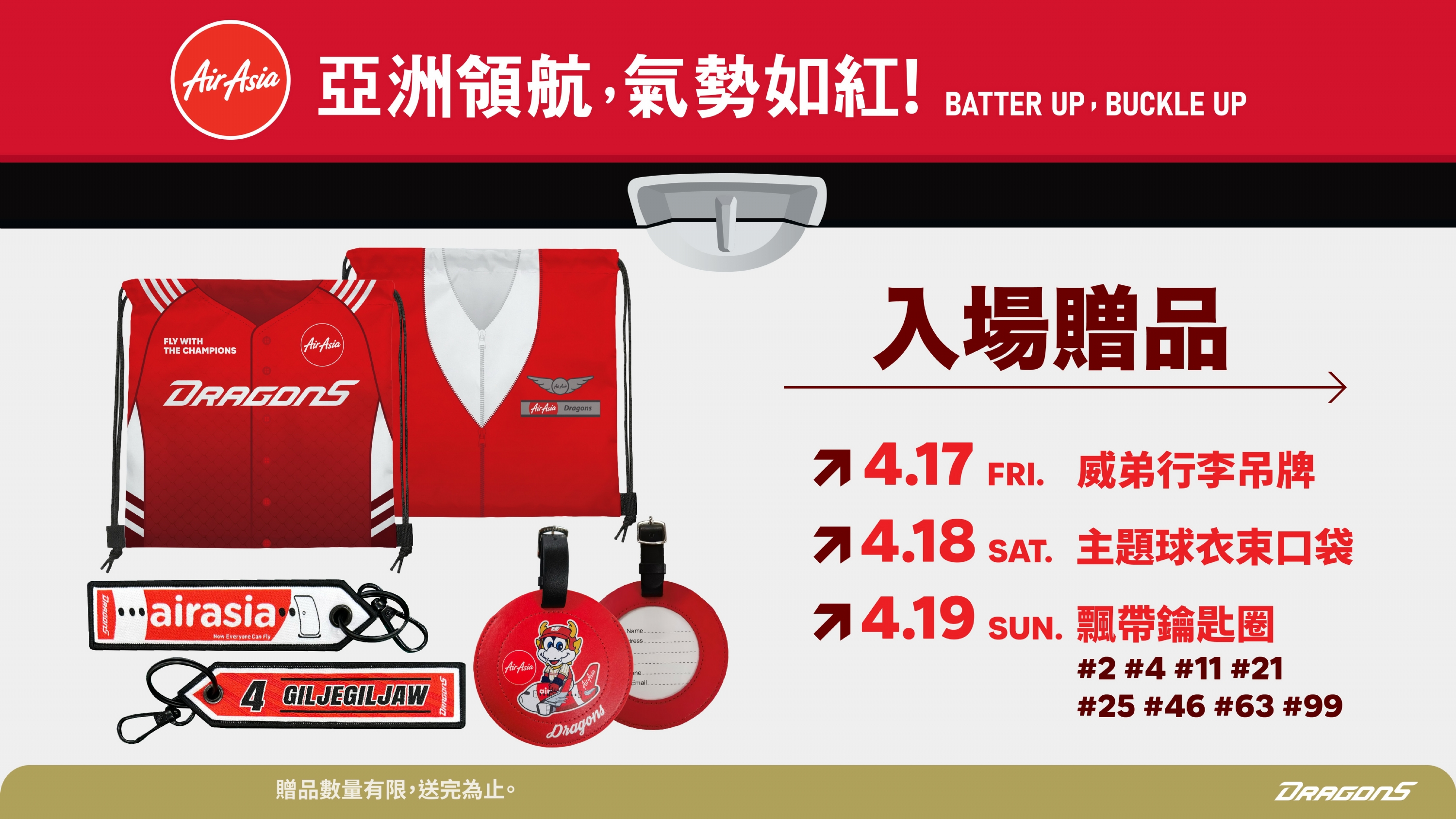 主題日三天將分別發送限量的威弟行李吊牌、AirAsia聯名主題日束口袋以及飛行飄帶鑰匙圈給進場球迷。