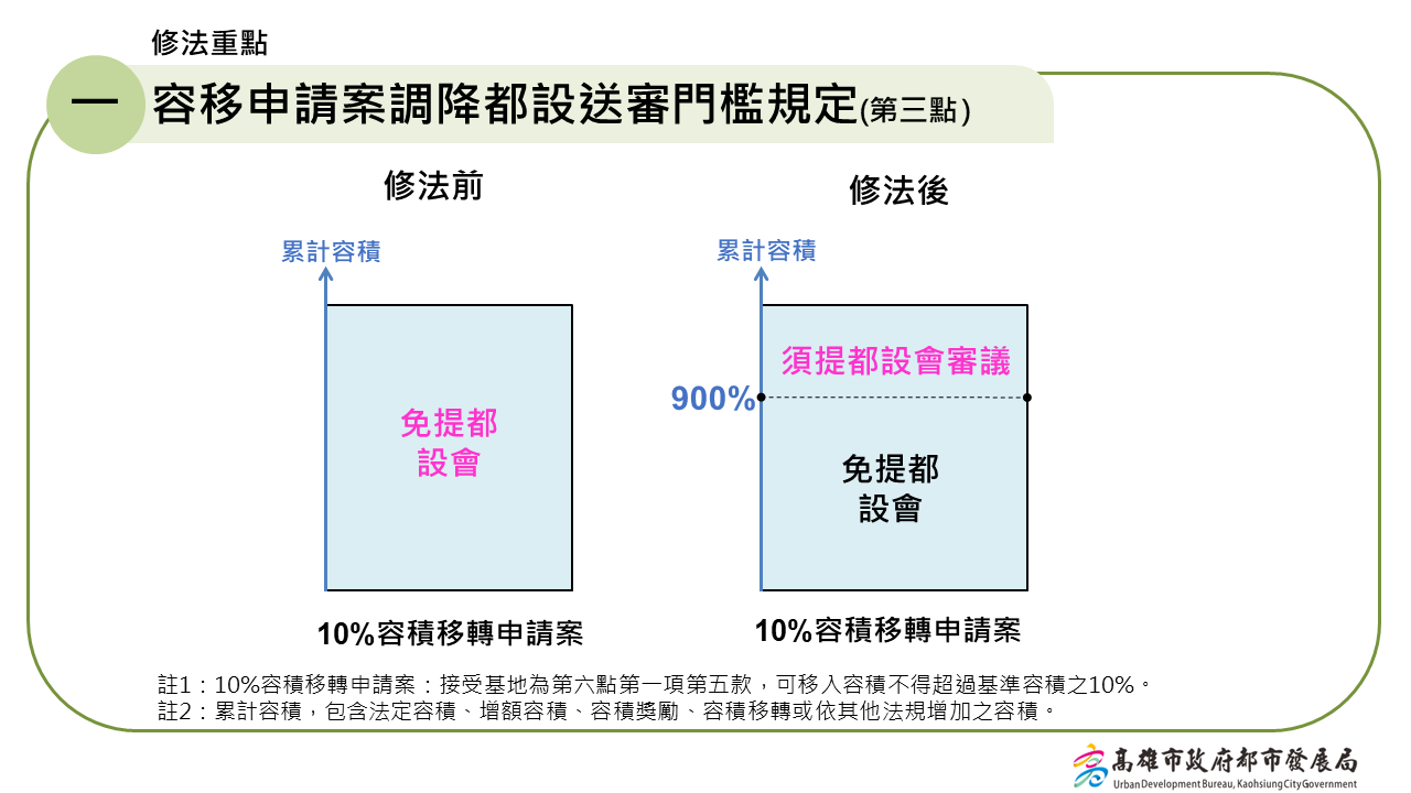 都發局特別指出,新的規定包括調整都市設計審查的申請門檻,並將排水道用地、溝渠用地及河道用地增列為容積移轉的可送出基地,從而加強城市防災功能。