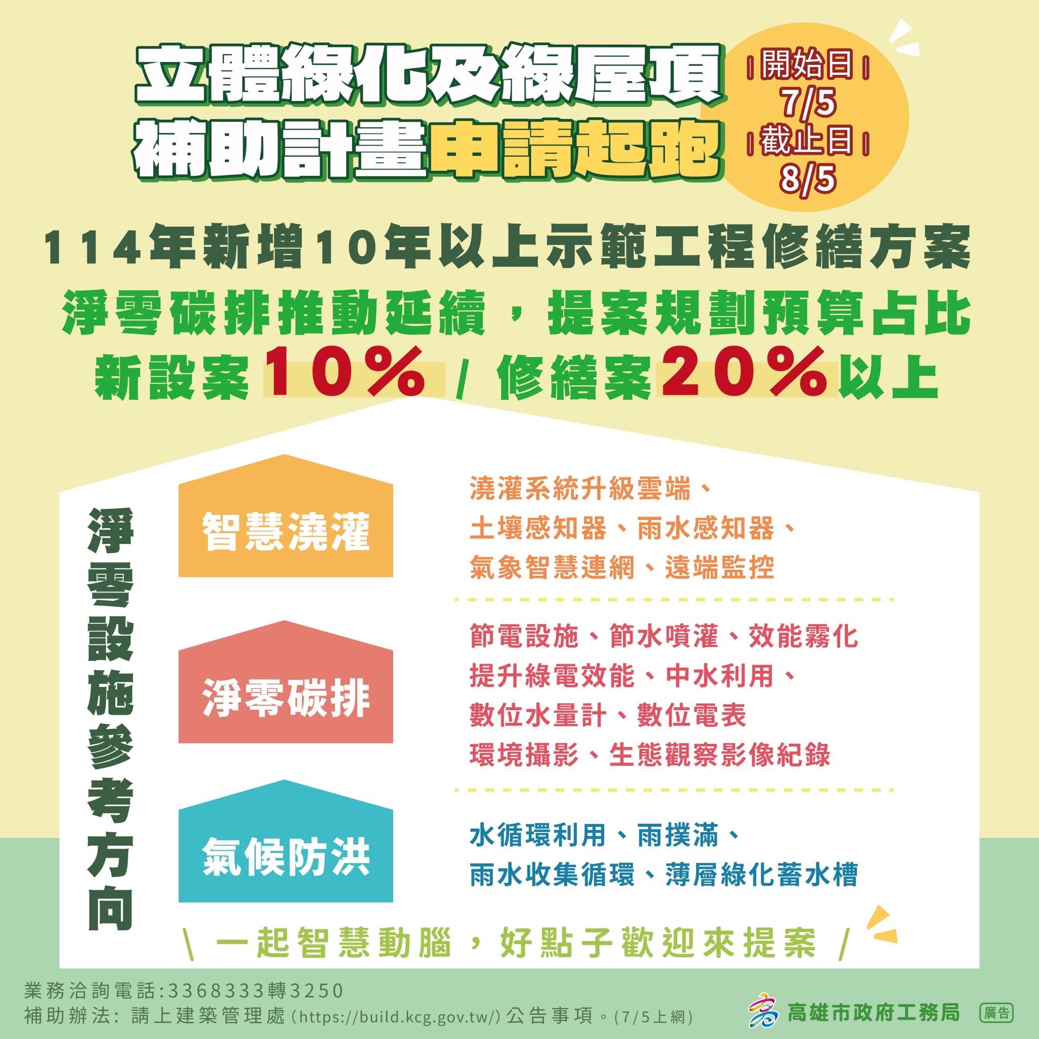 為了進一步拓展城市綠意、提升居住品質,高雄市工務局於7月4日起正式開放114年度第二階段「建築物立體綠化及綠屋頂補助」申請。