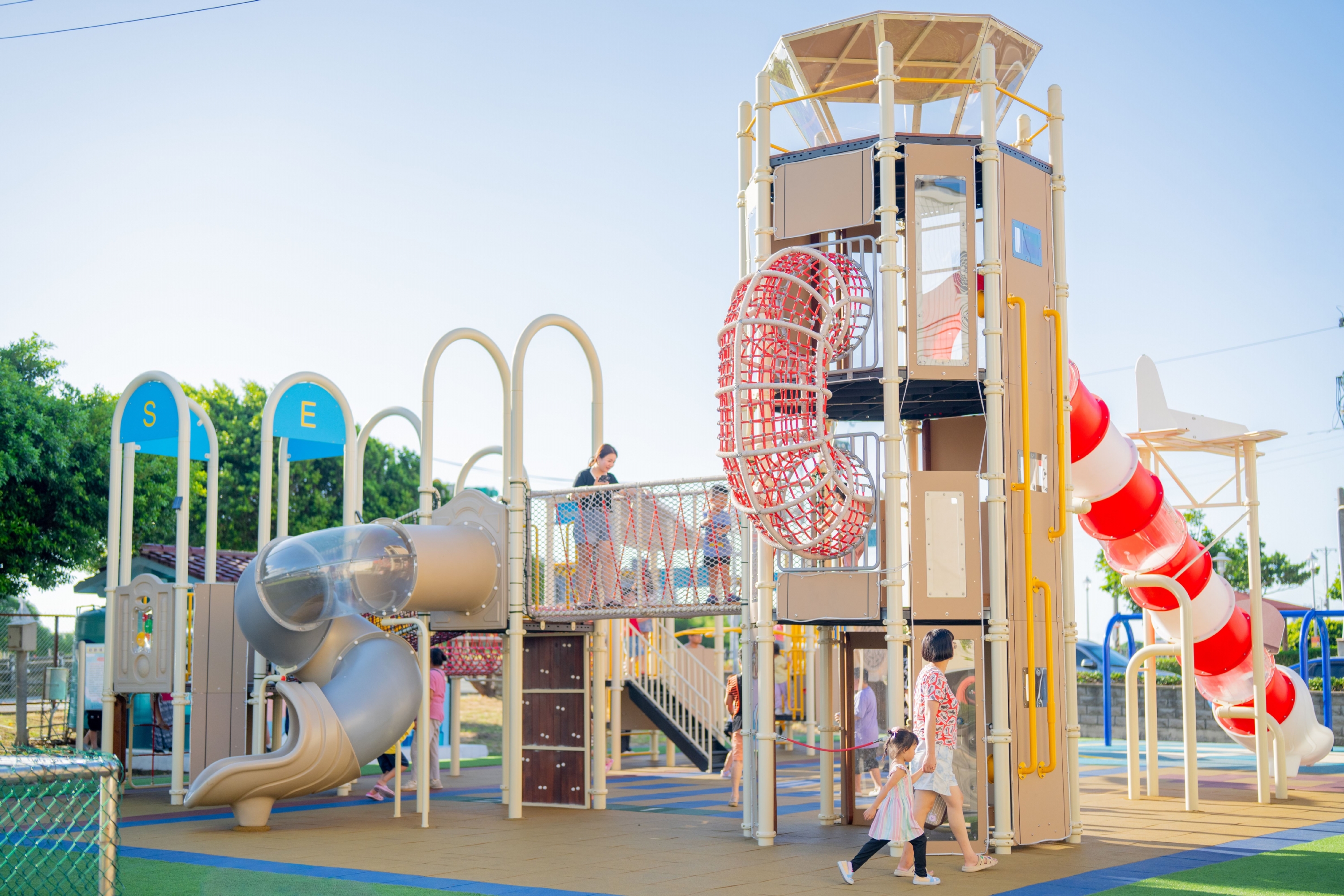 升級後的海寧公園遊戲場,以航空元素為核心,規劃出「航廈、塔台、跑道、天空及圍觀帶」等複合式遊戲區,清晰展現地方特色。