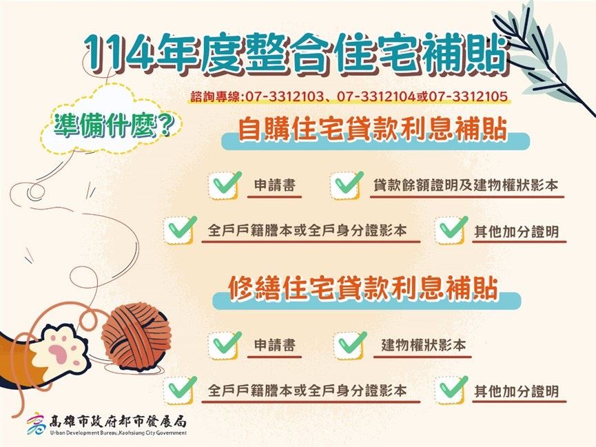 高雄市政府都市發展局宣布,114年度自購住宅貸款利息補貼及修繕住宅貸款利息補貼,自即日起至9月30日正式受理申請。
