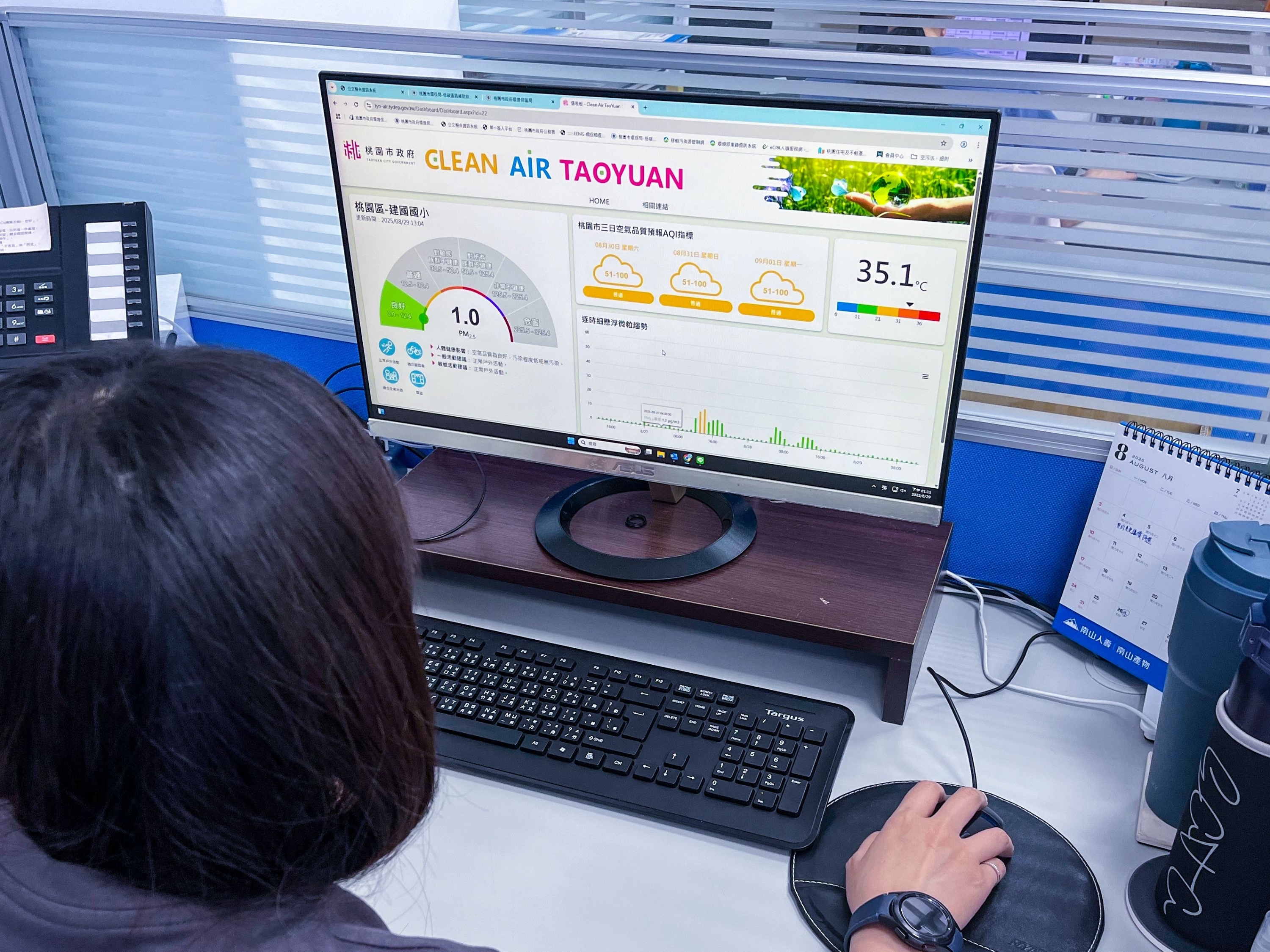 環保局補充說明,「校園空氣儀表板」以即時監測 PM2.5 與溫度為核心,提供視覺化的圖表與網頁查詢(網址:https://tyn-air.tydep.gov.tw/)。