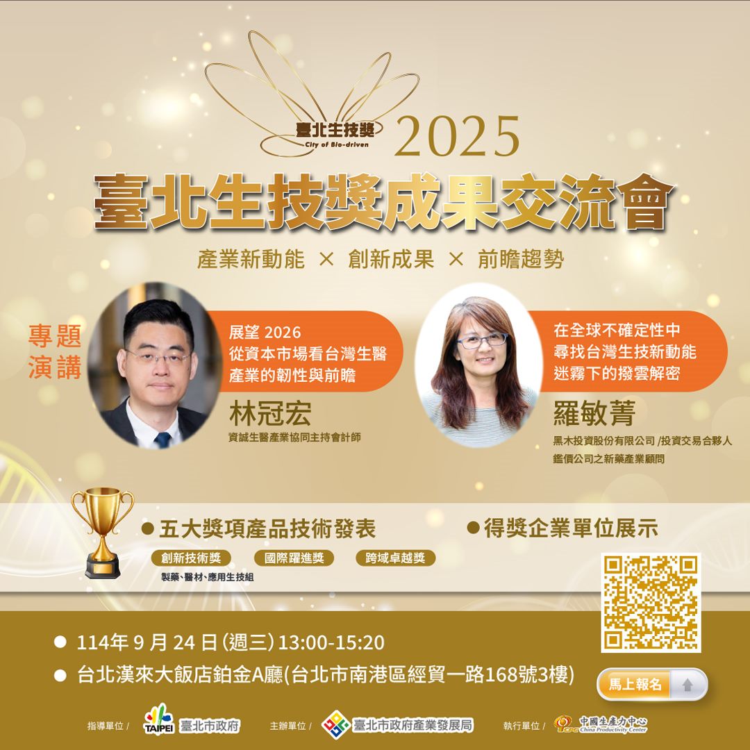 2025年9月24日(星期三)下午,臺北漢來大飯店鉑金A廳將迎來一場令人期待的盛會──「2025臺北生技獎成果交流會」。