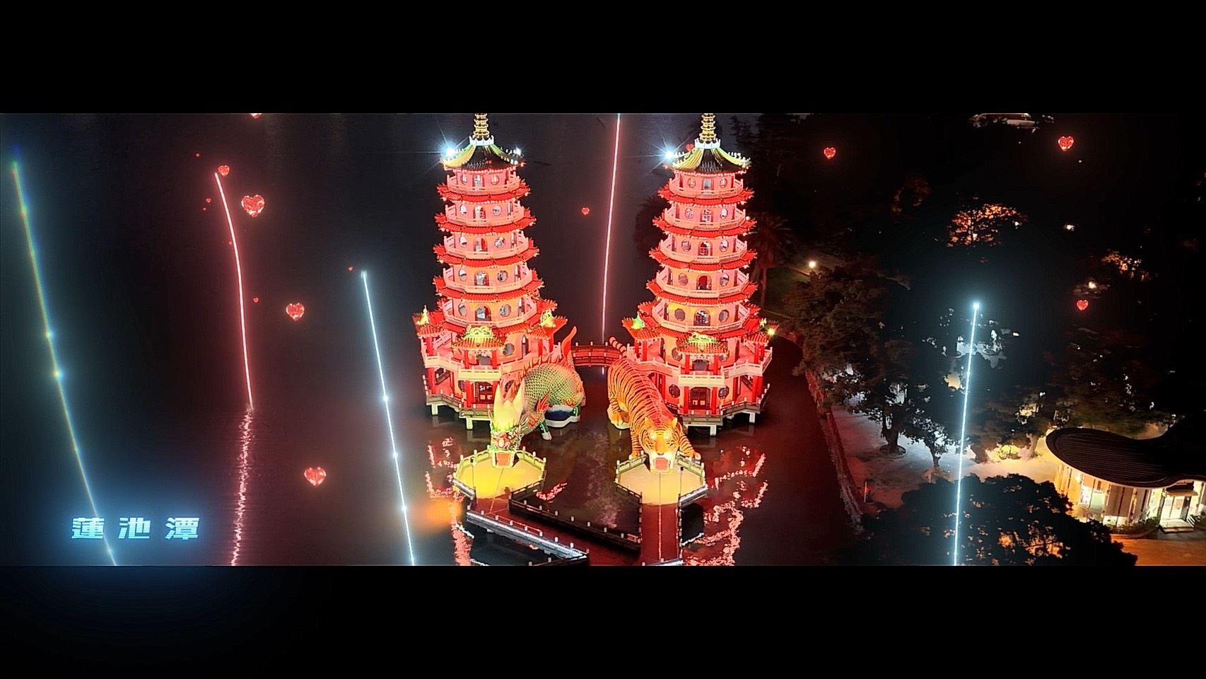 夜幕低垂時,燈光點亮高雄車站、蓮池潭龍虎塔、大港橋與亞洲新灣區等重要地標。