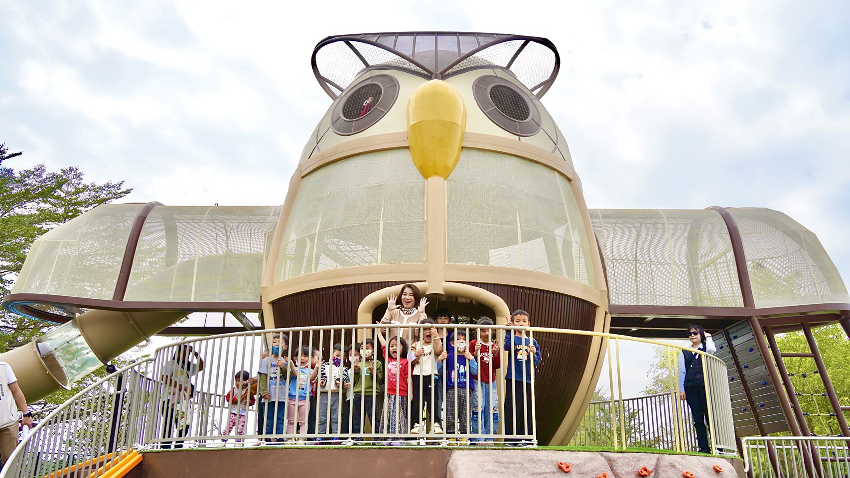 不少家長一早就帶著孩子前來「搶頭香」,小朋友一走進園區,立刻被高達8公尺的貓頭鷹造型主塔遊戲場吸引。