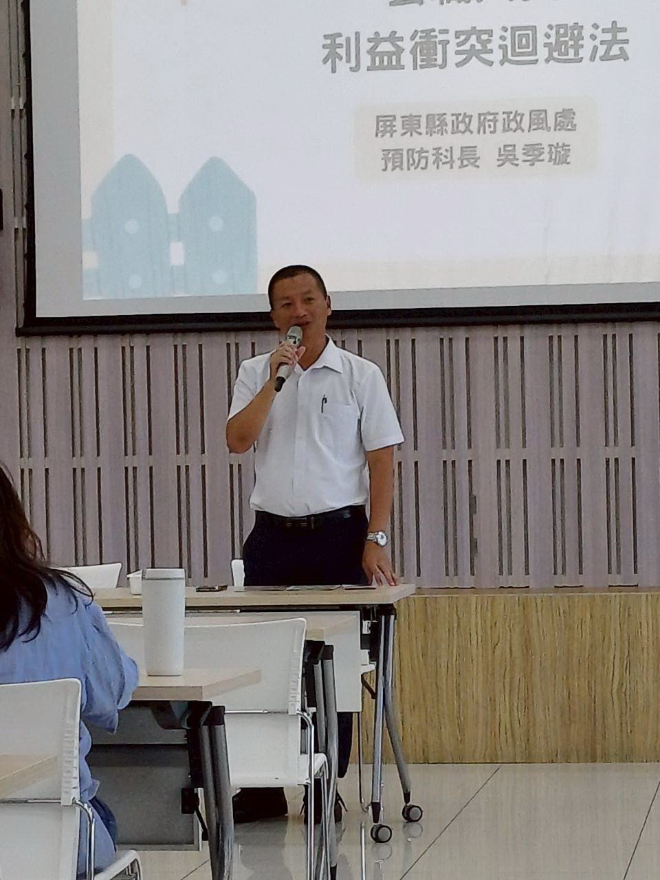 由政風處預防科科長吳季璇主講,吳科長擁有多年屏東縣利益衝突法實務經驗,透過淺顯易懂的語言,搭配縣內真實案例。