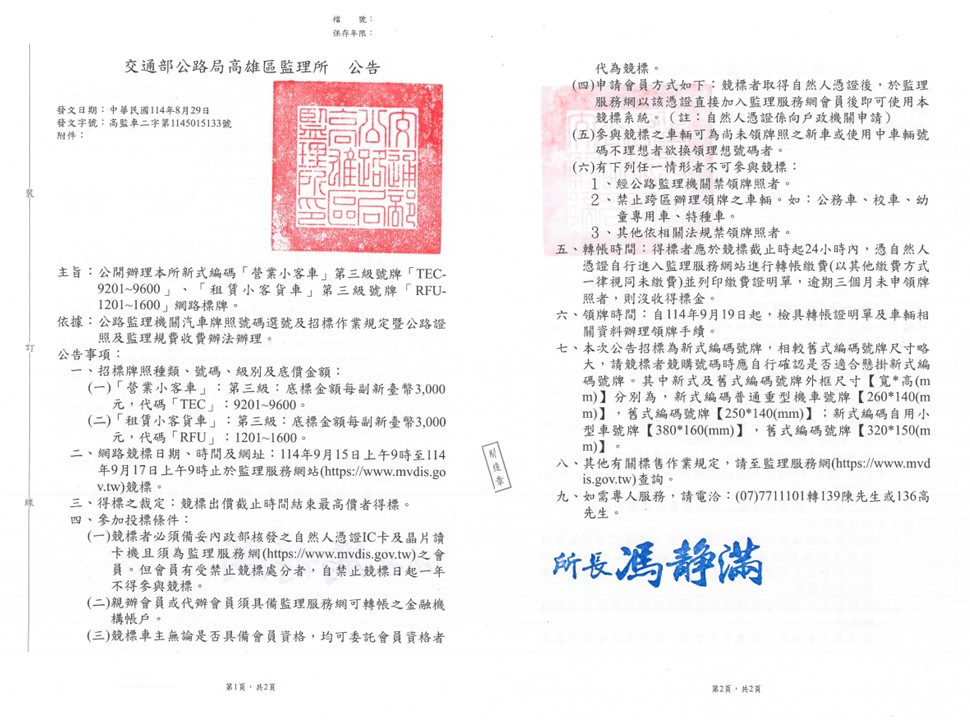 高雄區監理所釋出新式車牌!網路競標 9/15 起跑 3,000 元就能入手