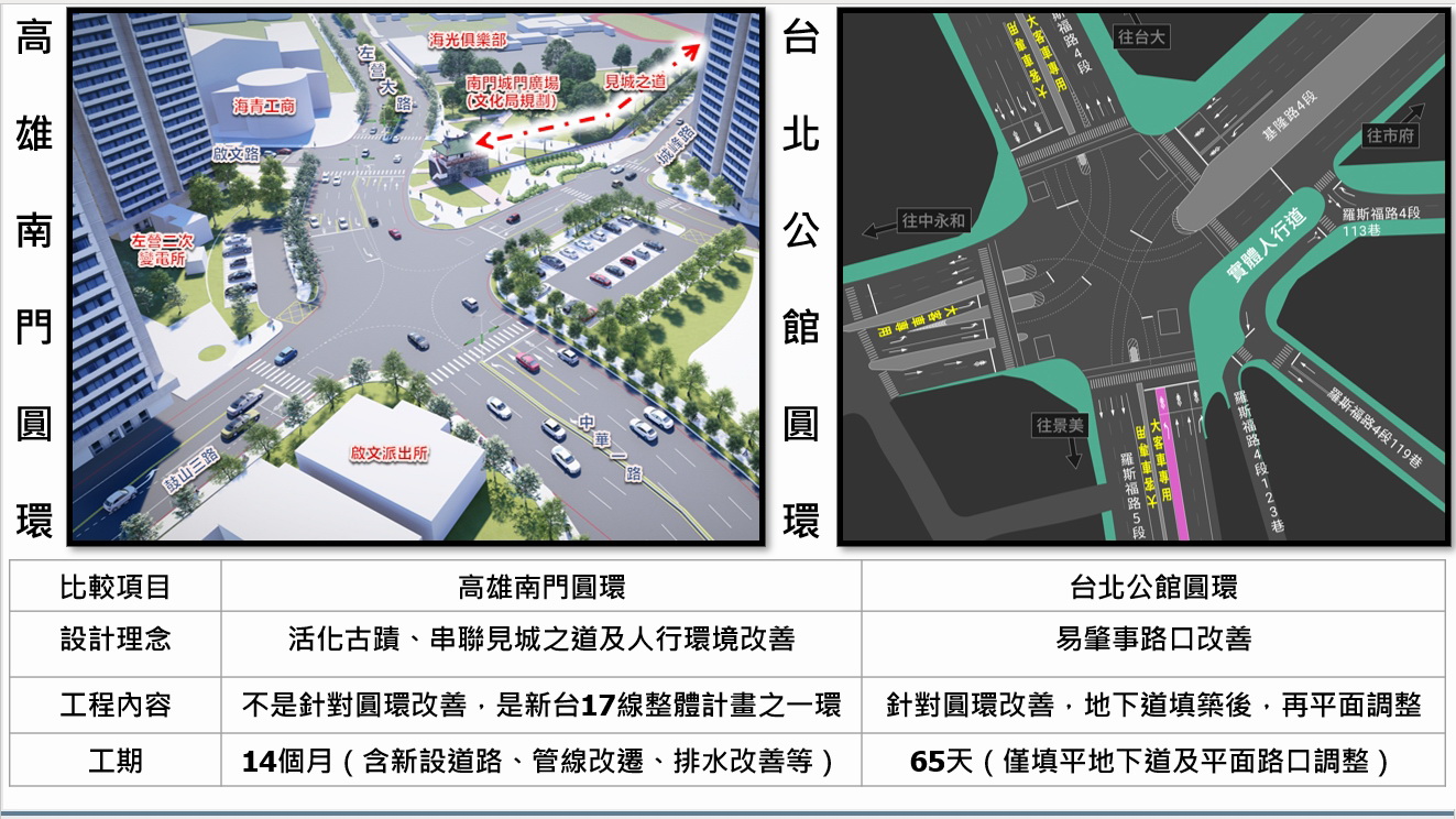 該案經中央審查,核定補助經費約 1.72 億元,規模遠大於僅進行平面化處理的台北公館圓環,兩者並無可比性。