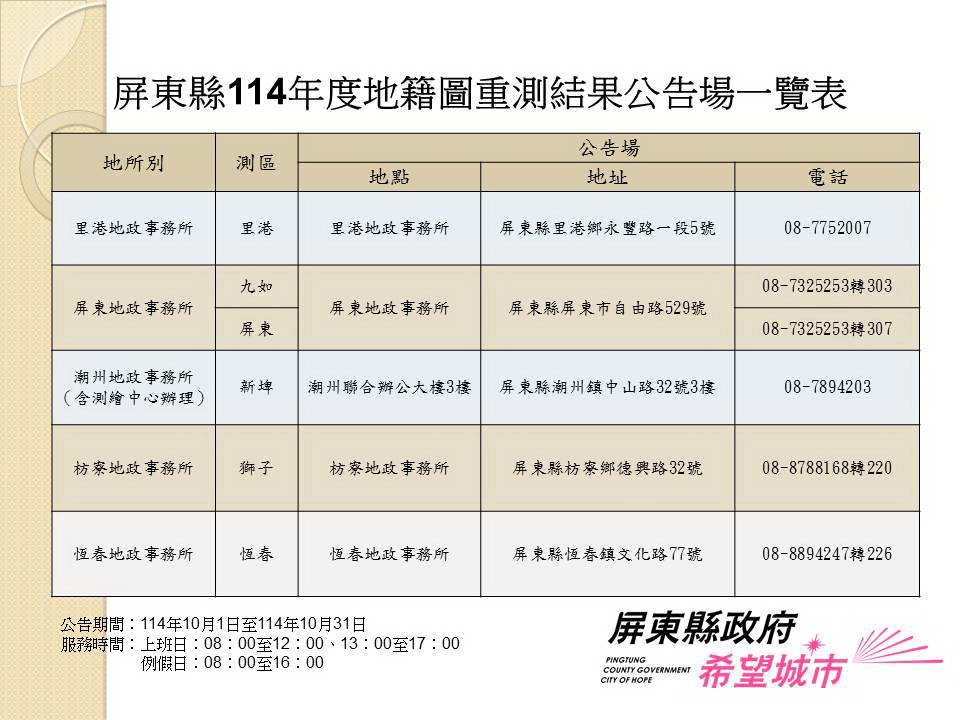 屏東縣政府宣布,114年度地籍圖重測成果自即日起至 10 月 31 日止正式公告。
