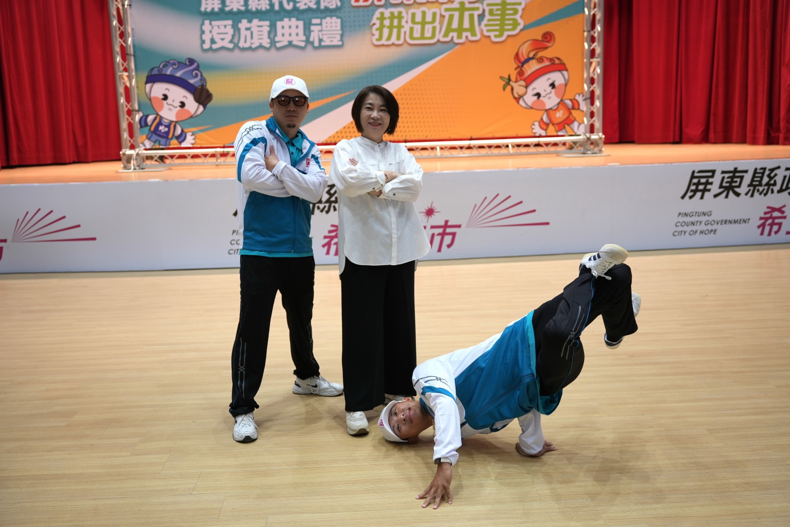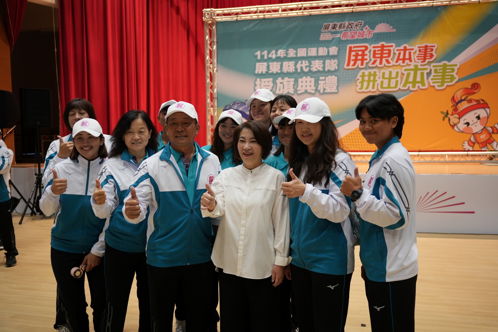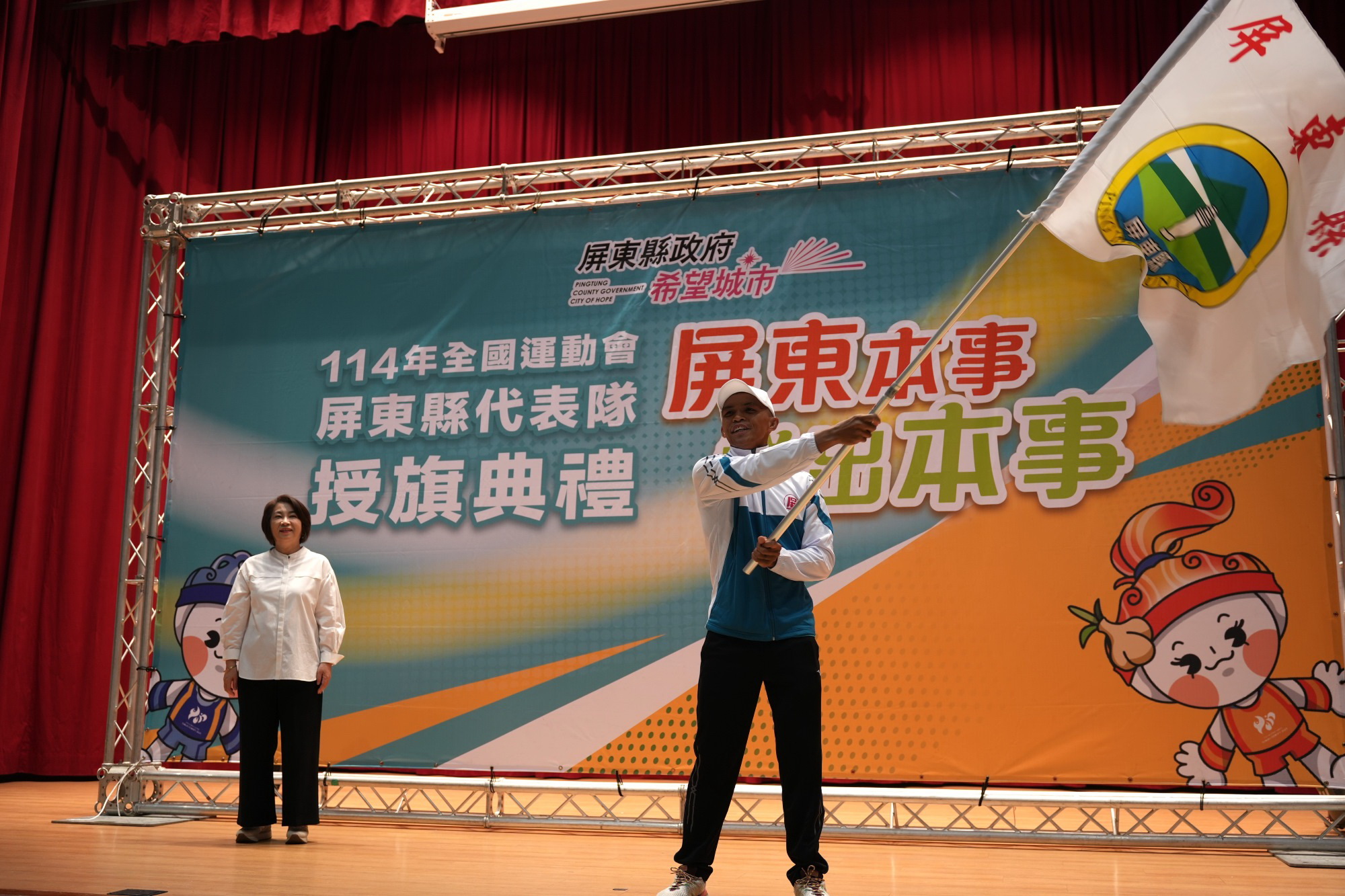 屏東縣政府今(14)日上午在縣府大禮堂舉行授旗典禮,縣長周春米親自授旗並致贈運動服。