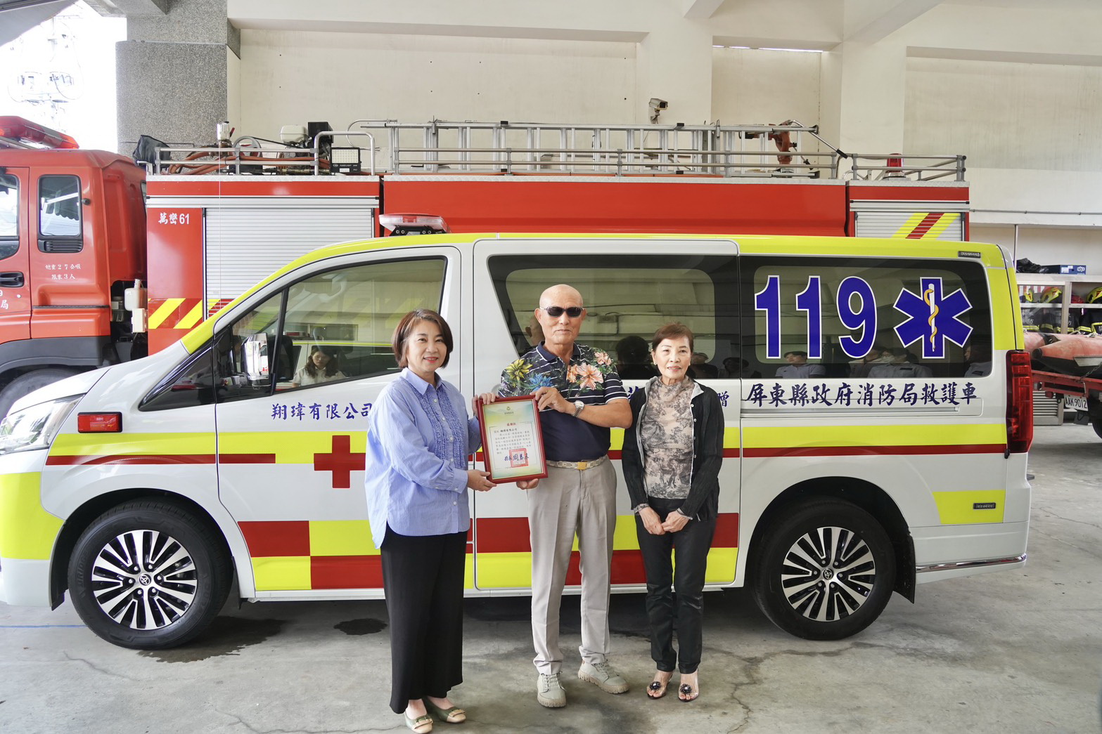 與家族成員 陳義敏、蘇素卿 於近日慷慨捐贈一輛全新救護車予屏東縣政府,捐贈儀式在 萬巒消防分隊 舉行。