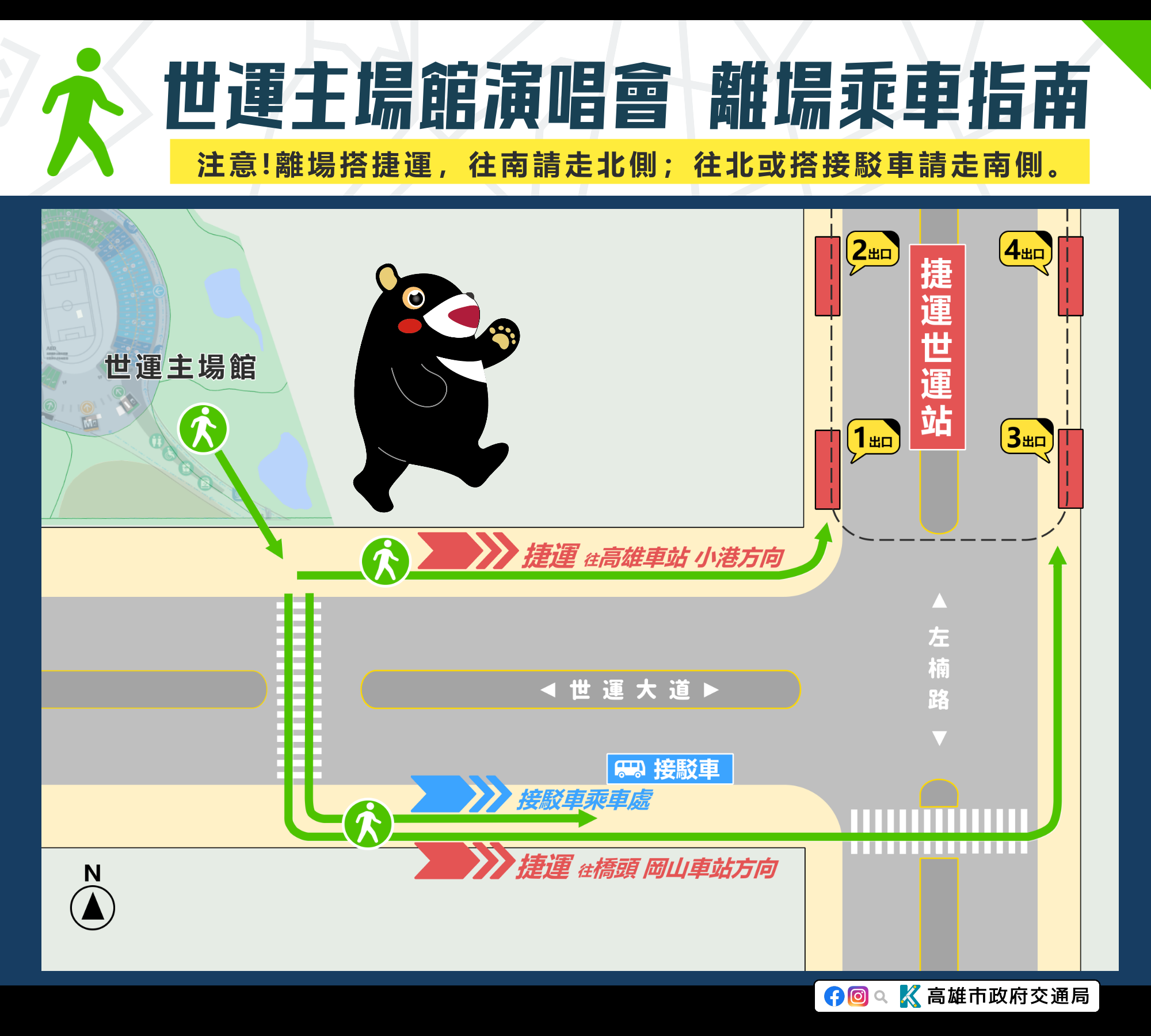 世運演唱會當天也將安排免費接駁專車,14時30分至18時30分提供「高鐵左營站/台鐵新左營站-演唱會場」進場接駁車服務。
