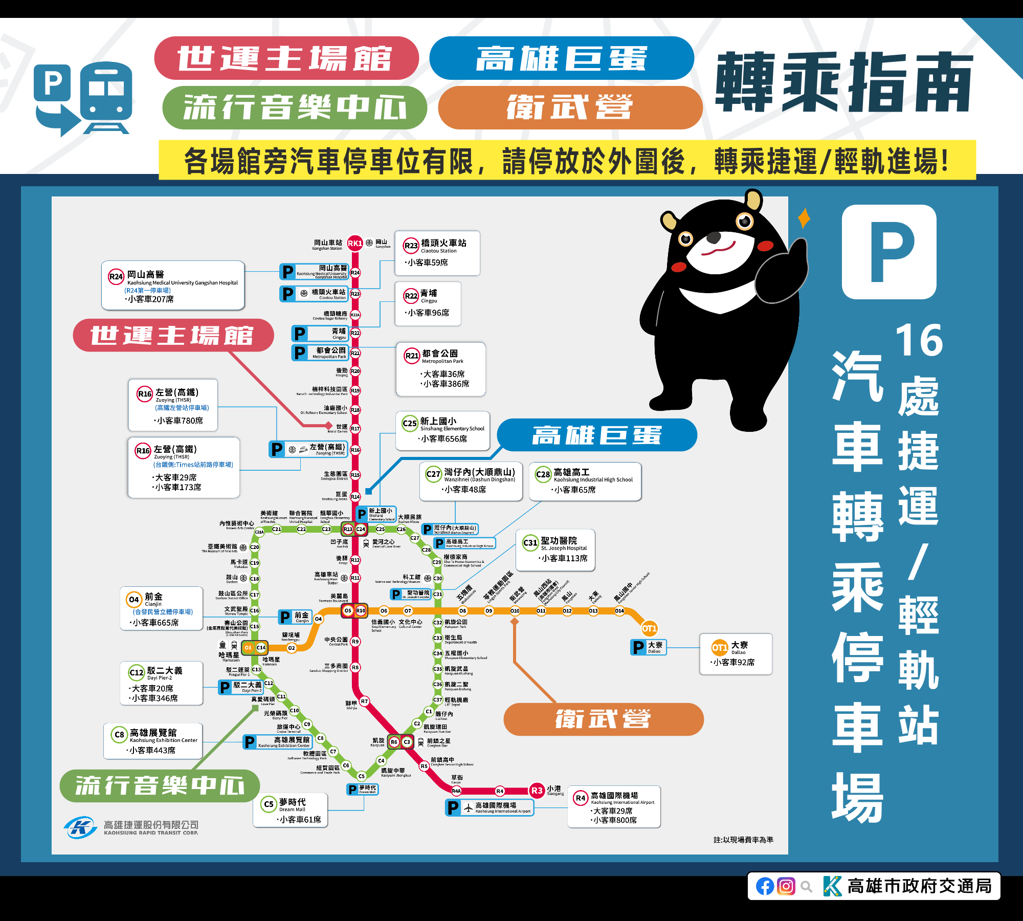 此外,世運演唱會機車臨時停放區規劃於世運主場館西北側、軍校路西側(世運大道至海功路)及軍校路西側眷村(緯一路至緯四路)。