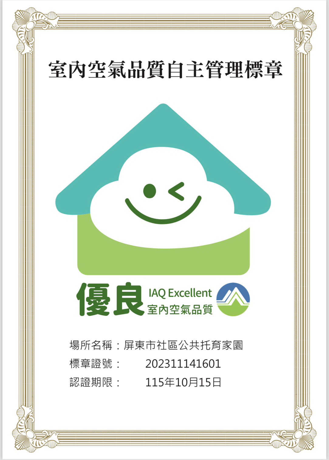 截至目前,屏東縣 10 家公共托育中心,7 家已取得室內空氣品質自主管理標章,包括屏東、鹽埔、忠孝、萬丹、內埔、潮州及恆春。