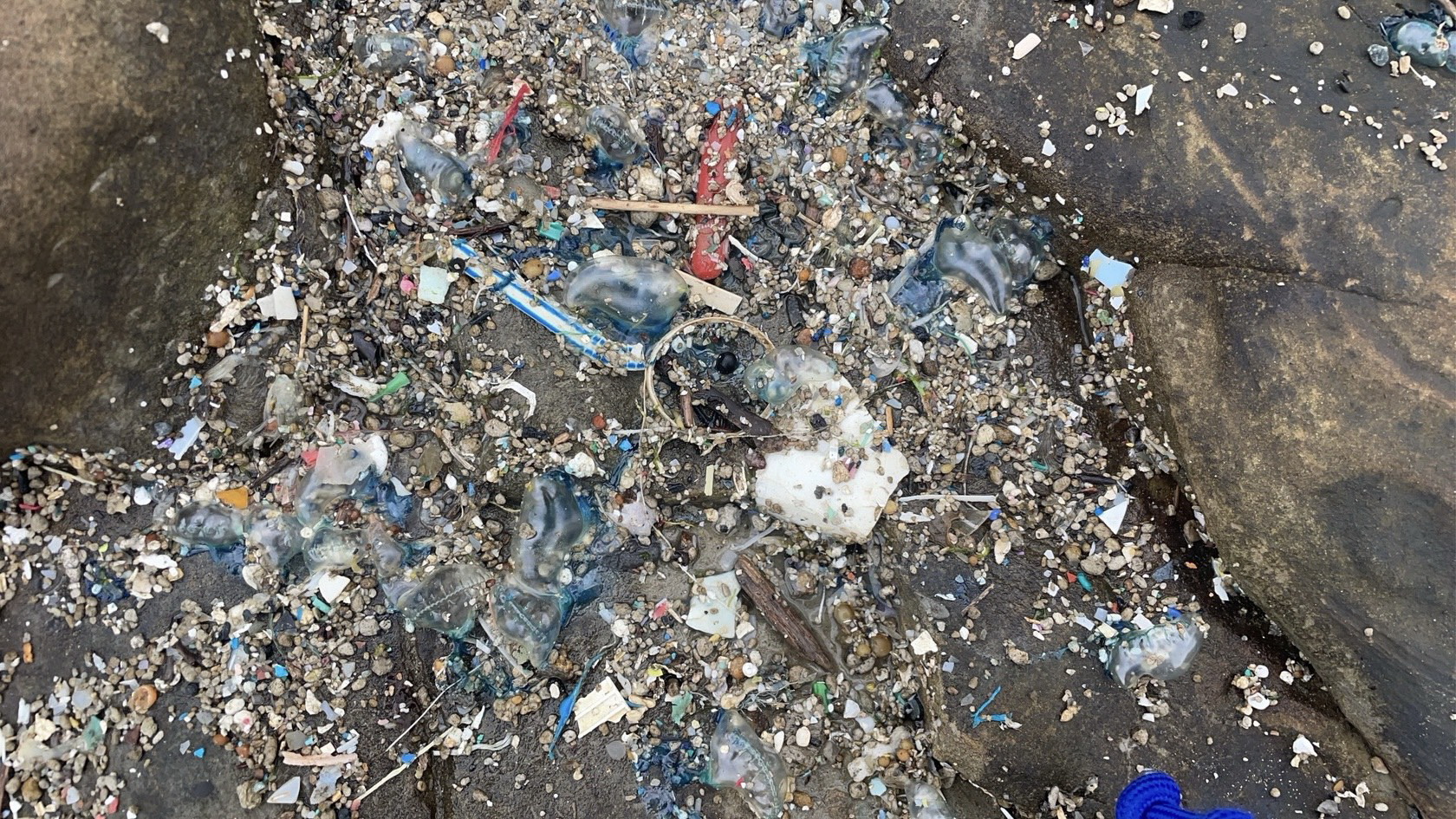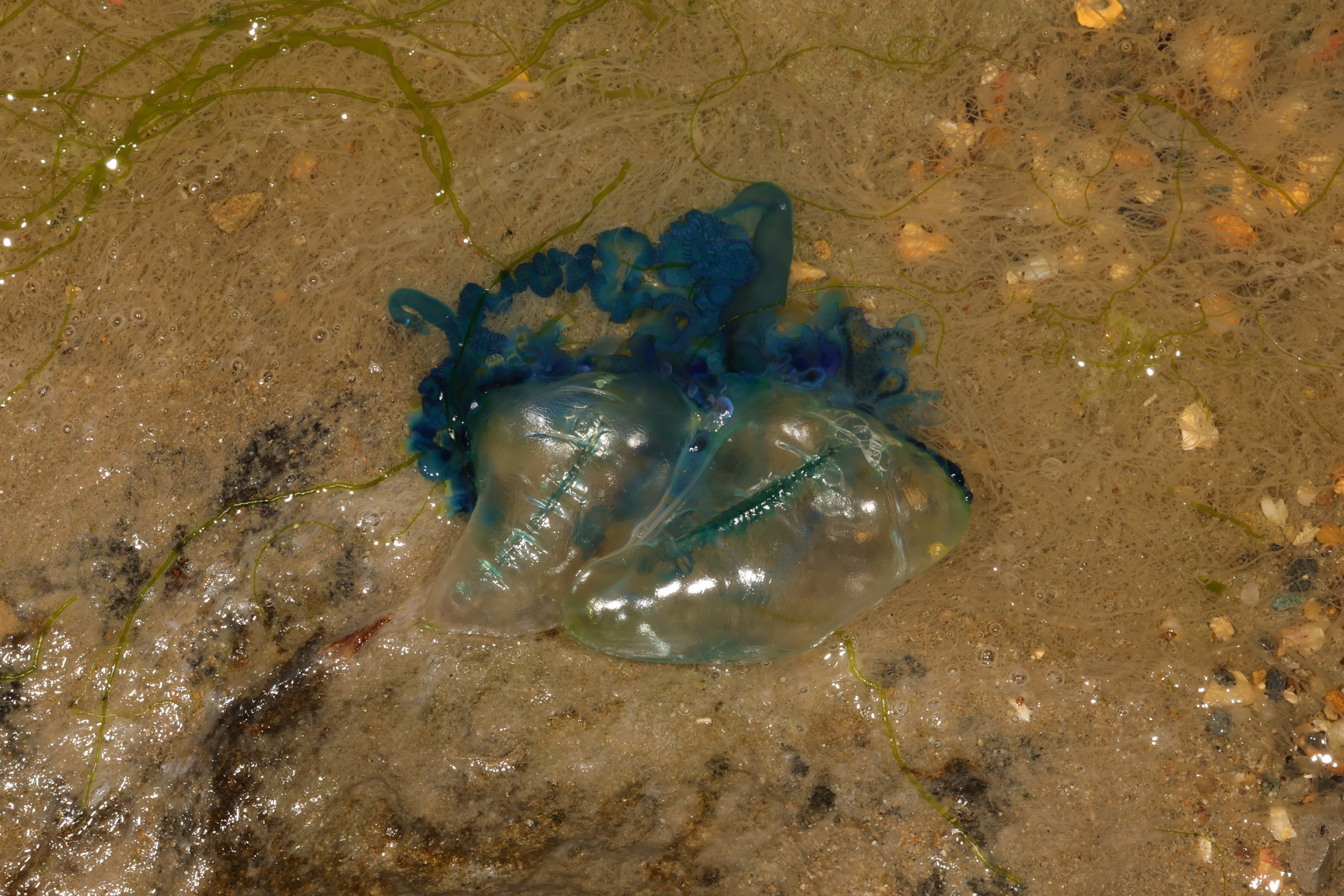 望海巷潮境保育區外圍之潮間帶,近期民眾走訪潮間帶目視到大量僧帽水母(葡萄牙戰艦(Physalia physalis)聚集。