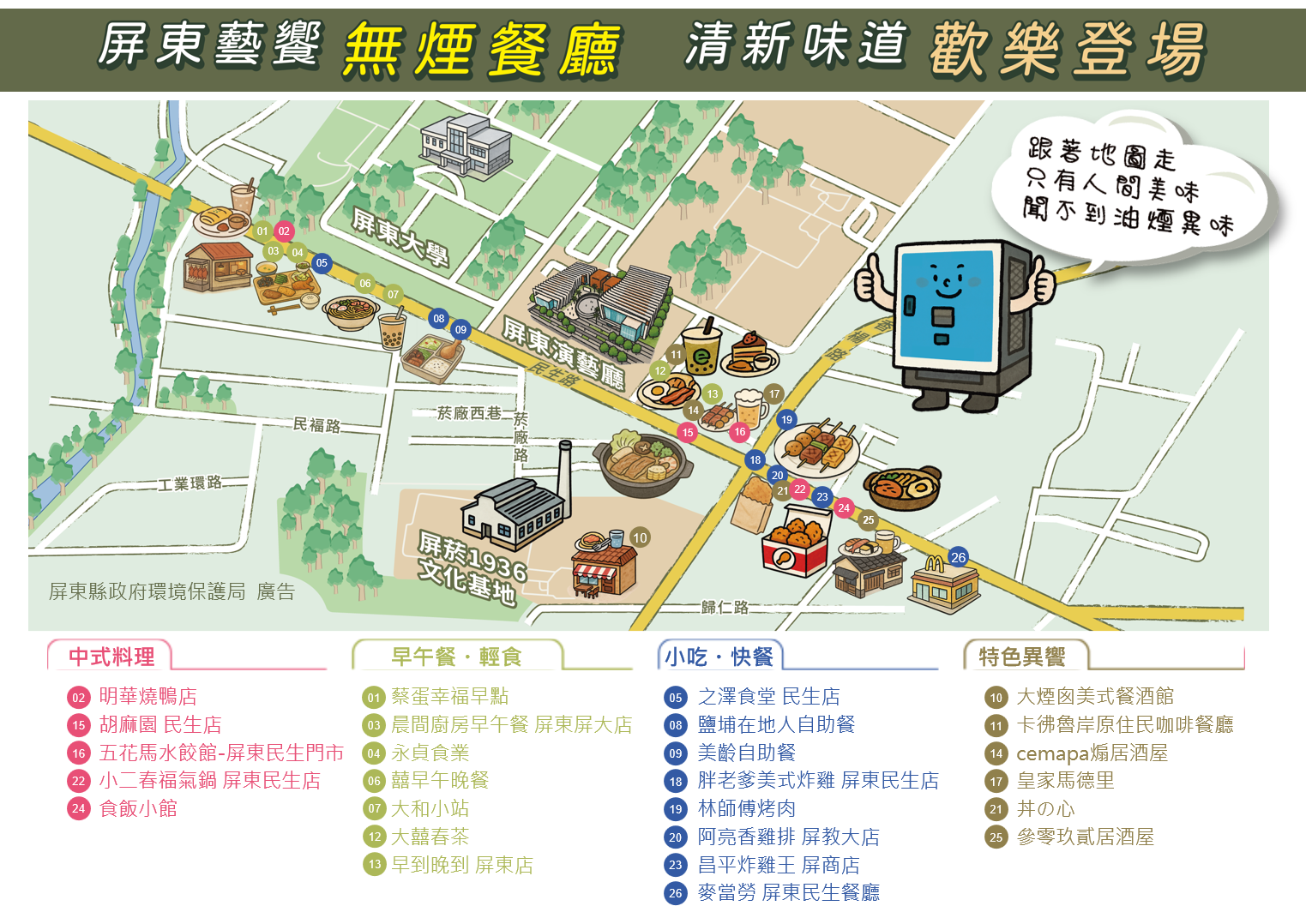 並推出「藝饗無煙餐廳美食地圖」,讓民眾在滿滿藝文氛圍的環境中,輕鬆享受無油煙的美食。