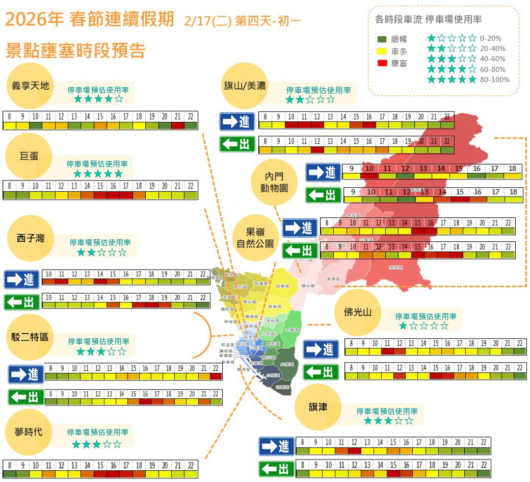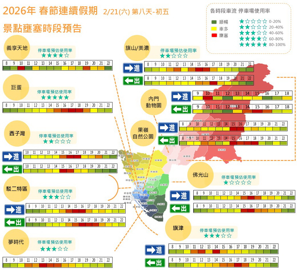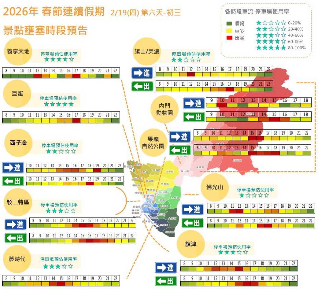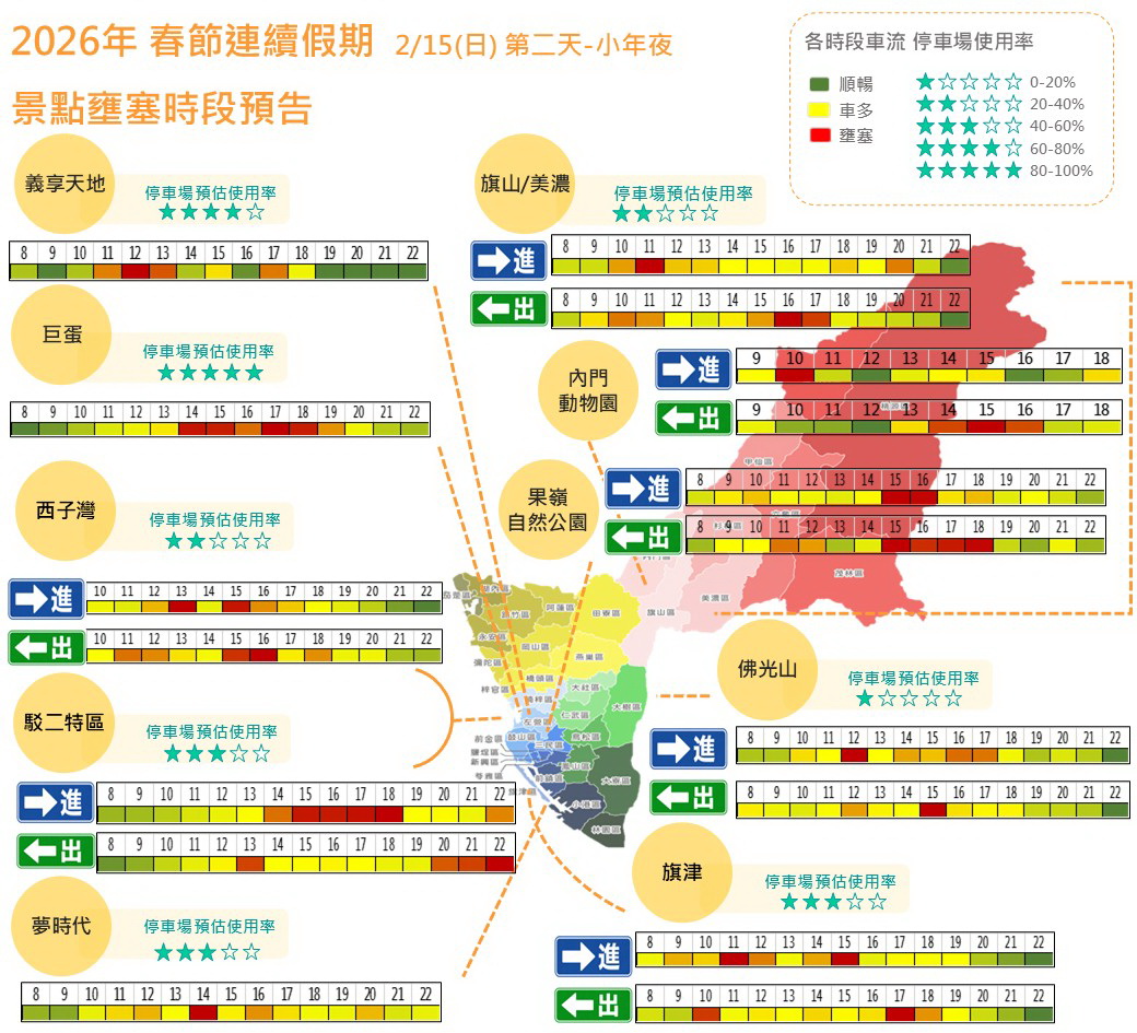 高雄市政府交通局彙整春節活動資訊與車流預測,預估返鄉與出遊車潮將明顯增加。
