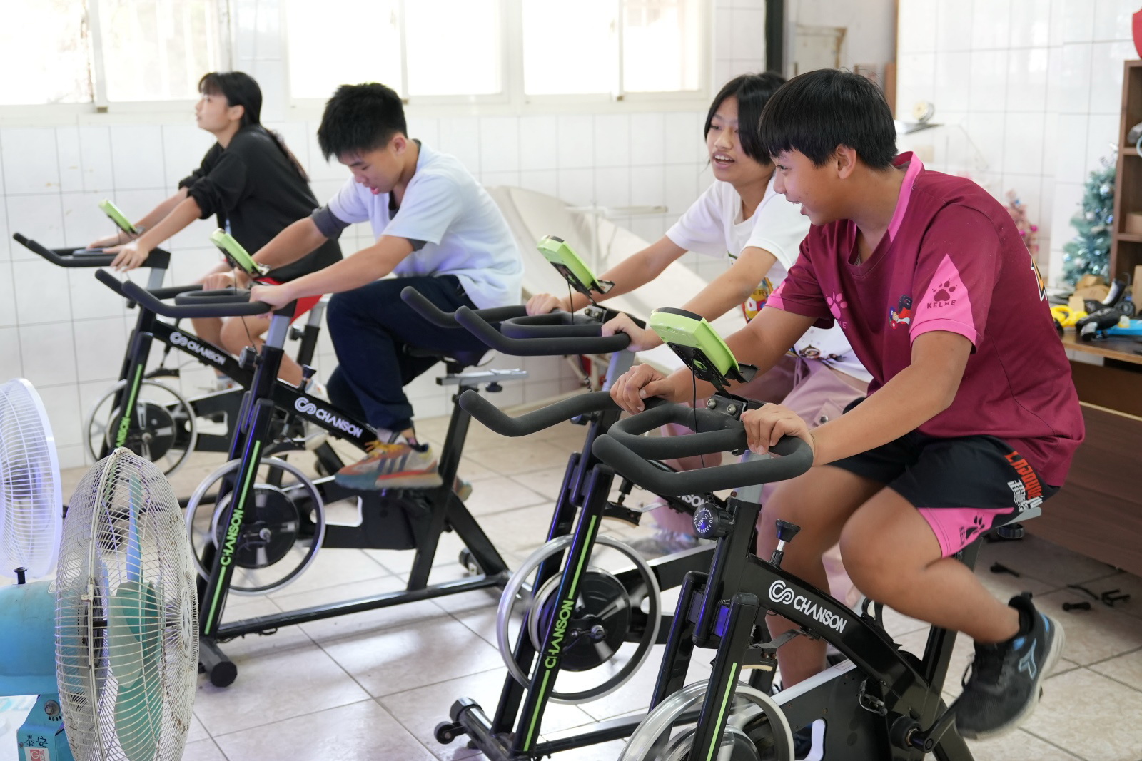 閒置廚房改造的創客教室,學生們奮力踩著人力發電腳踏車,產生的電流供給前方放置的電風扇,享受涼風外,還能體驗運動發電的樂趣。