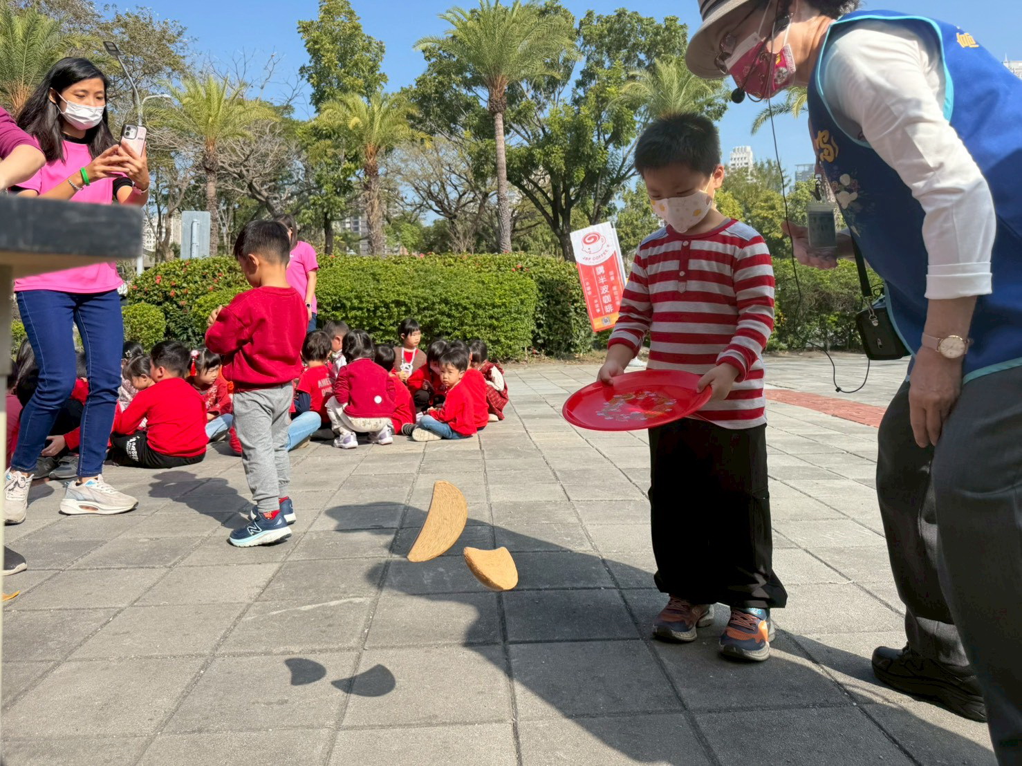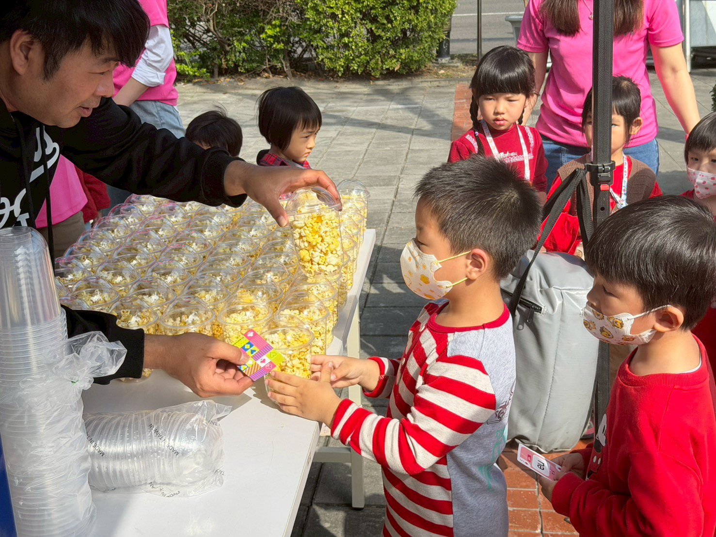 活動現場還有「擲聖筊換爆米花」活動,將祭祀中請示神明的文化意涵轉化為親子互動體驗。