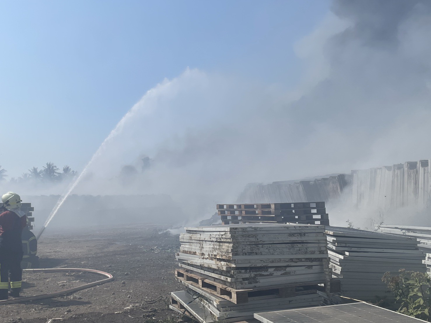 屏東縣林邊鄉一處太陽能板戶外暫置場(17)日發生火警事件,經消防局調派人車及重機具進行阻隔與灌救。