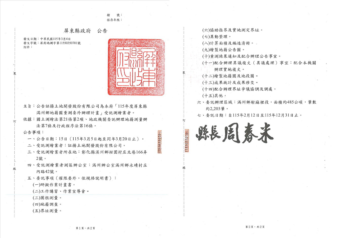 委由証揚土地開發股份有限公司辦理,並由本府地政處與恆春地政事務所共同督導執行。