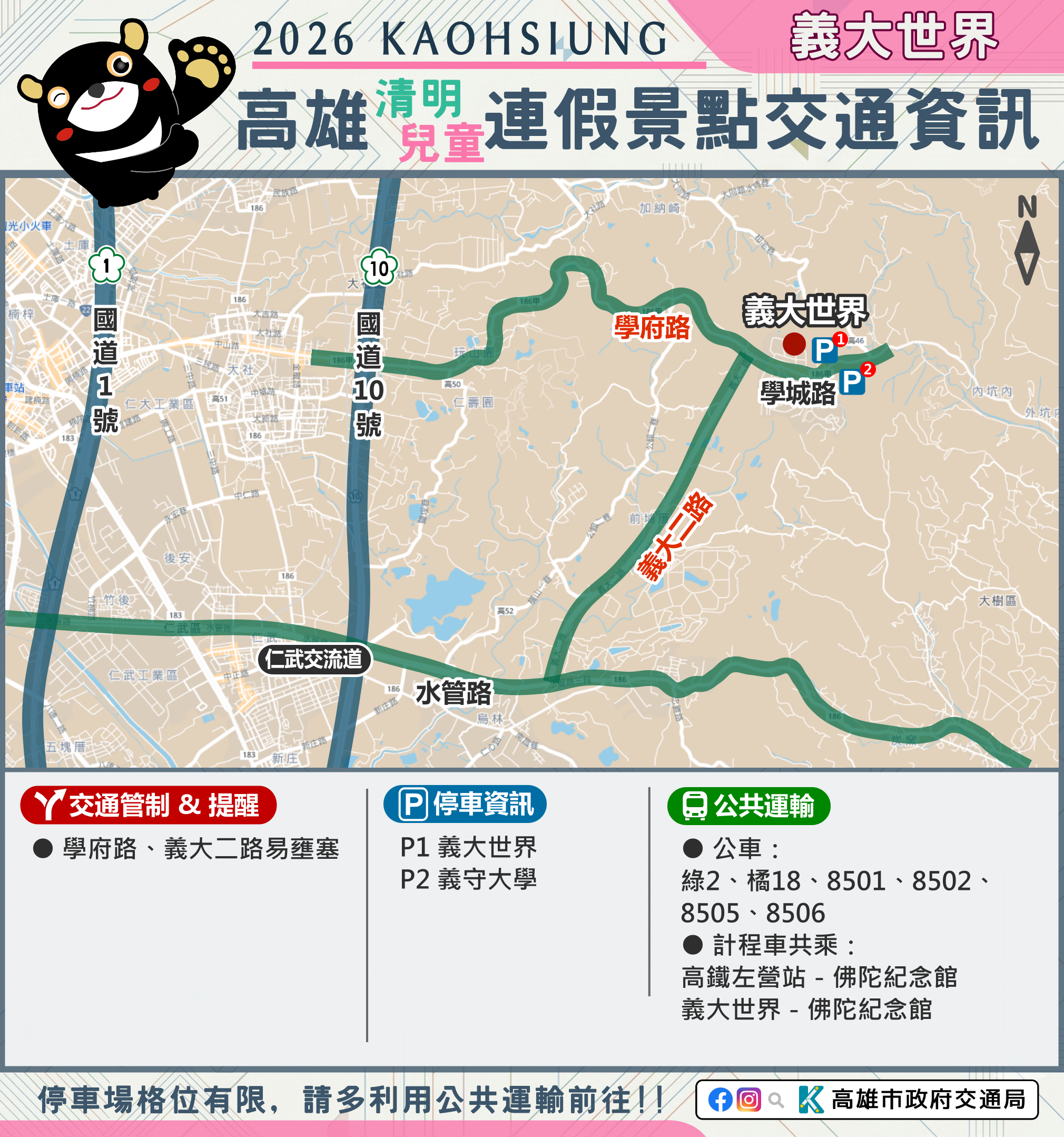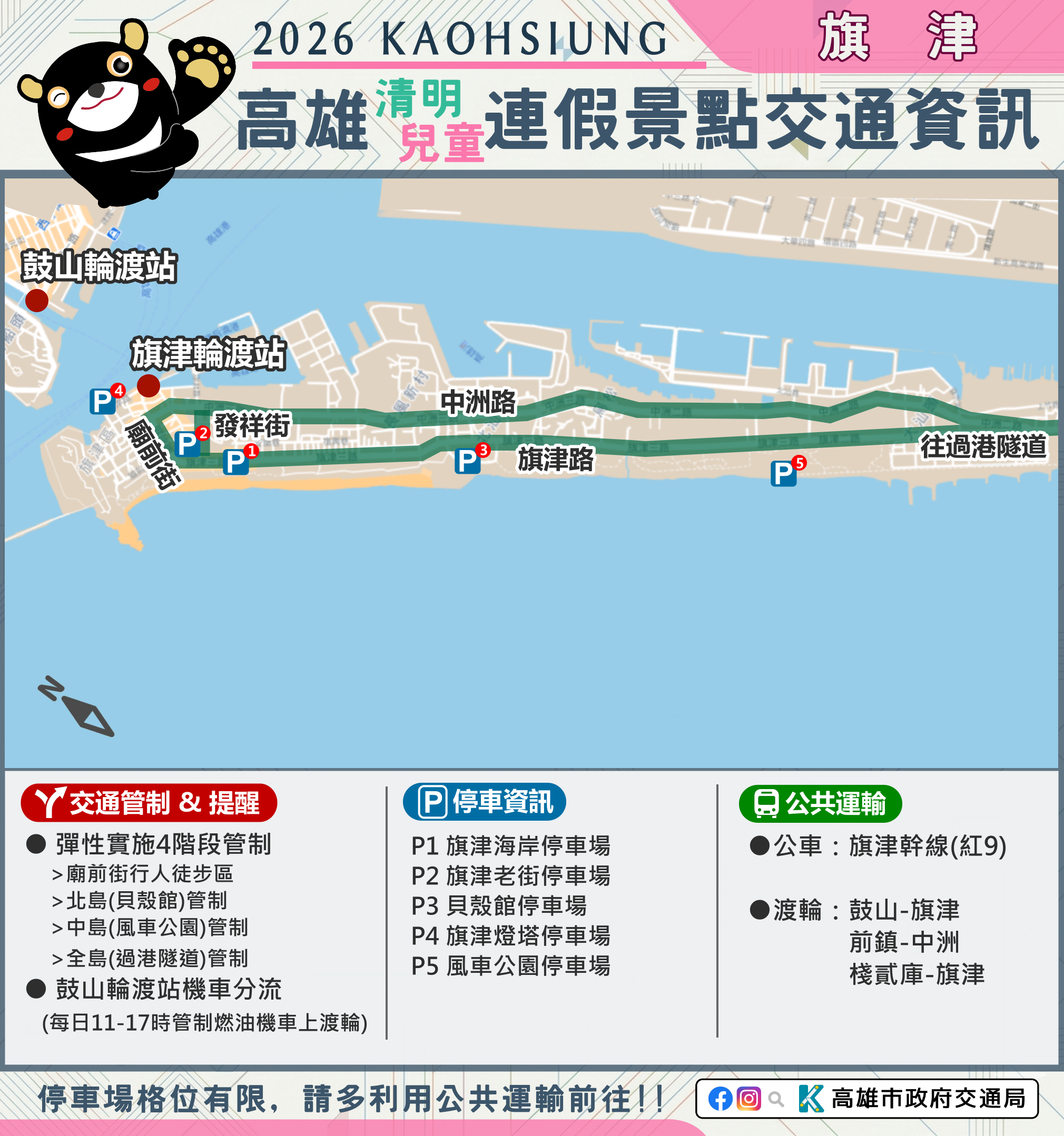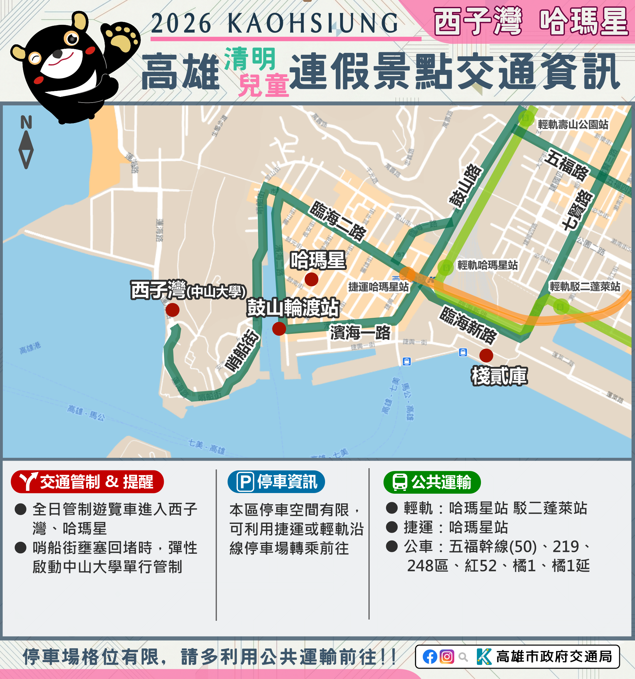 市府相關景點及活動交通管制資訊可至市府Line、臉書、市府交通局( https://www.tbkc.gov.tw/ )、「轉動高雄青春夢」及「高雄旅遊網」等臉書查詢。預祝大家行車平安 !