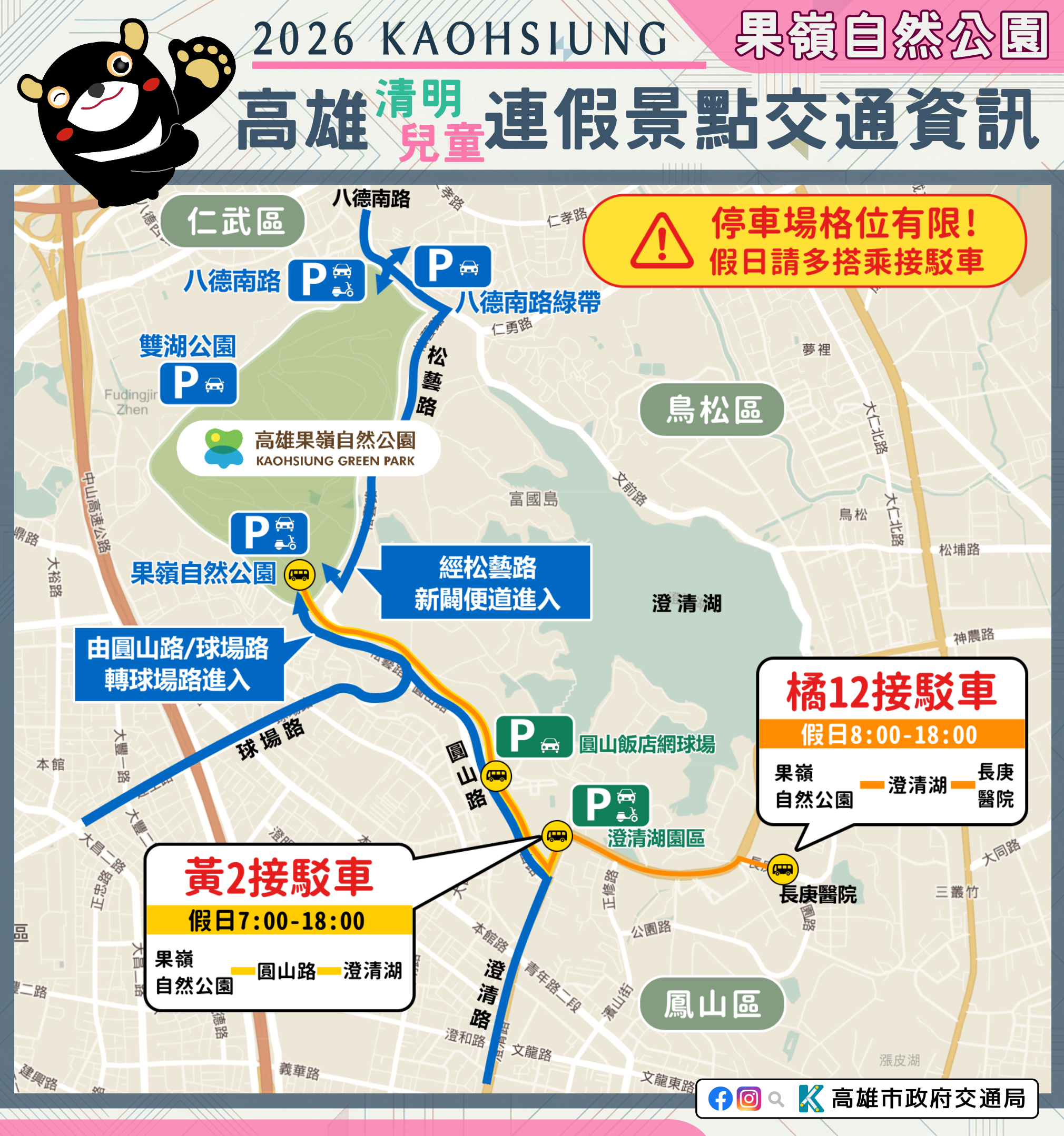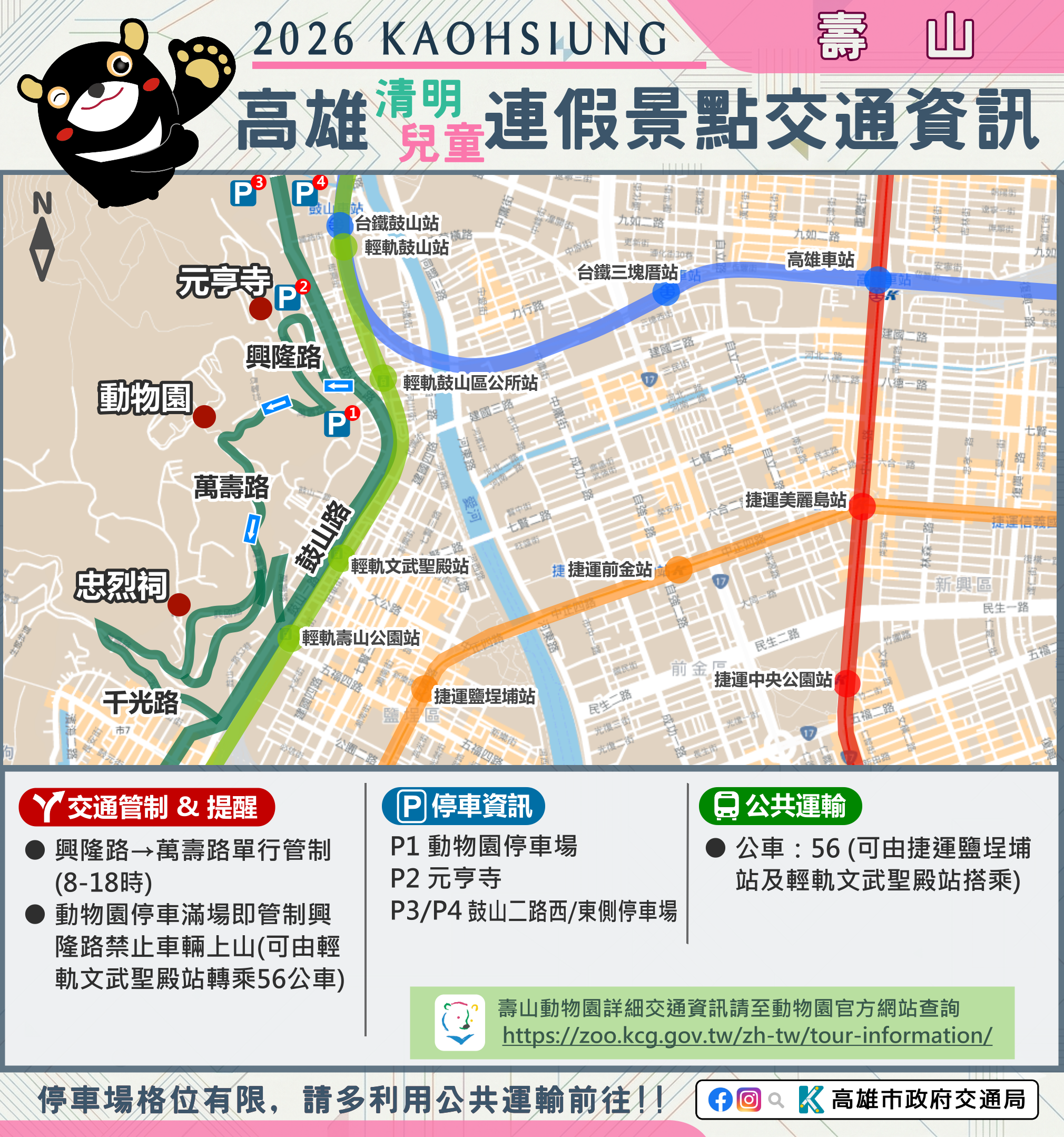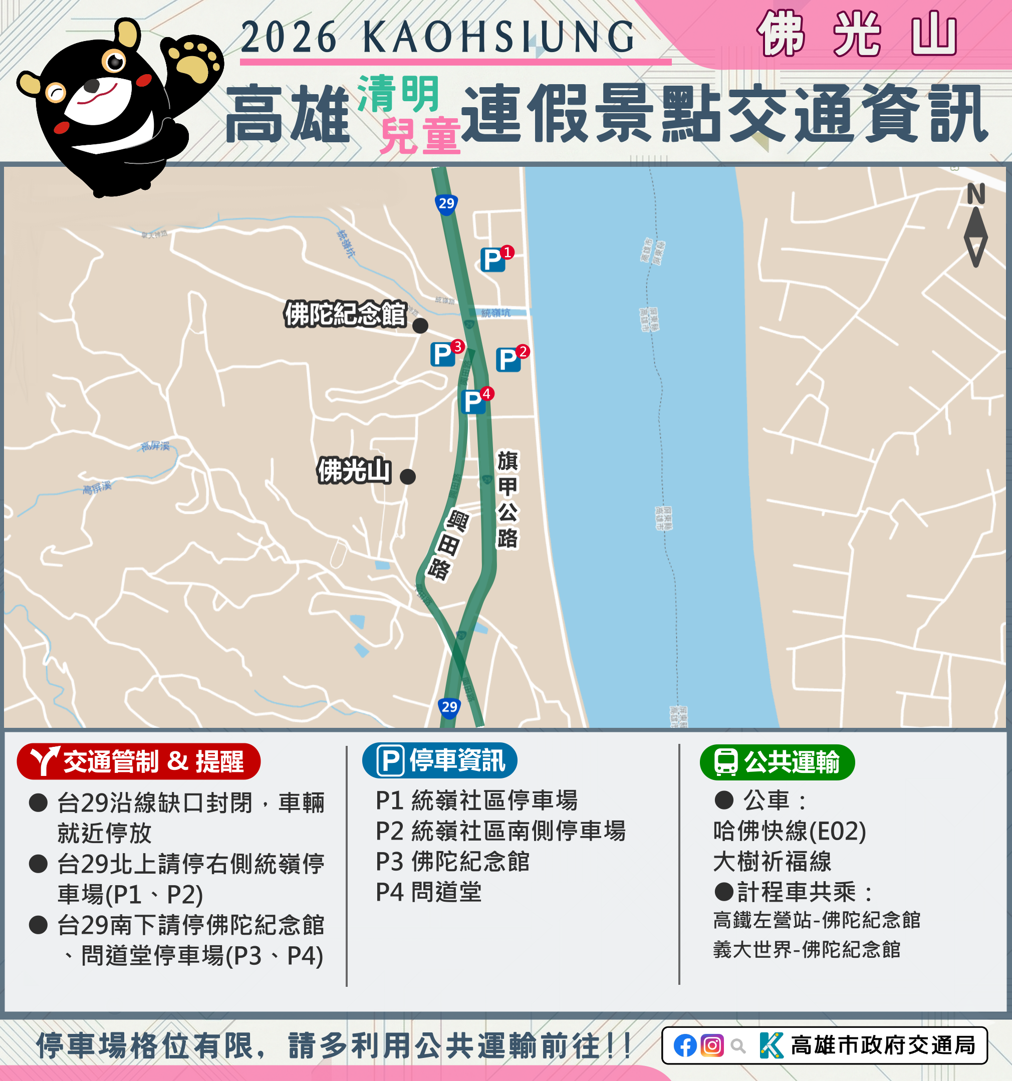 市府相關景點及活動交通管制資訊可至市府Line、臉書、市府交通局( https://www.tbkc.gov.tw/ )、「轉動高雄青春夢」及「高雄旅遊網」等臉書查詢。預祝大家行車平安 !