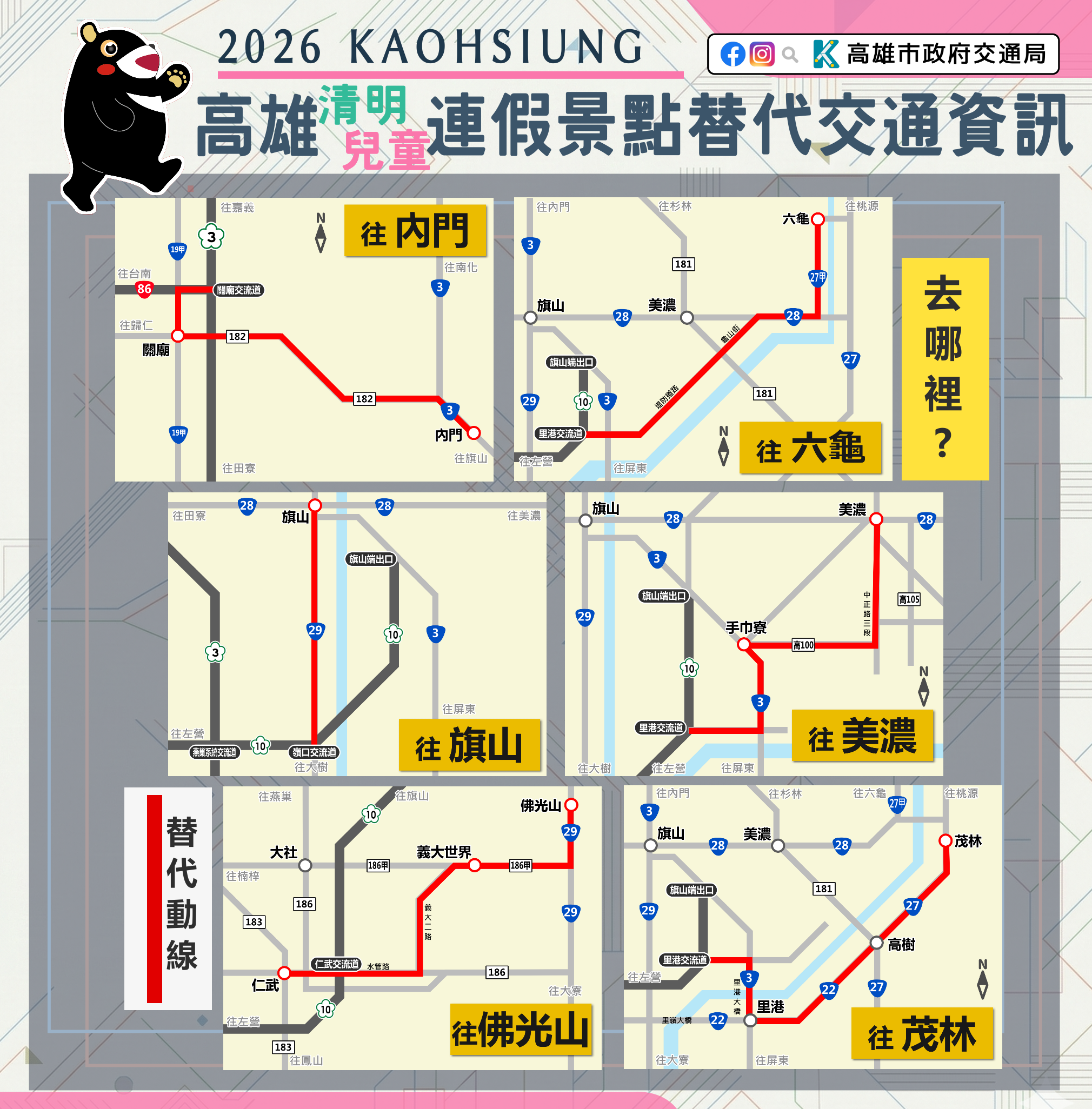 出門前可多利用高雄市即時交通資訊網( https://traffic.tbkc.gov.tw )、省道即時交通資訊網等查詢即時交通路況,並適時行駛替代道路。