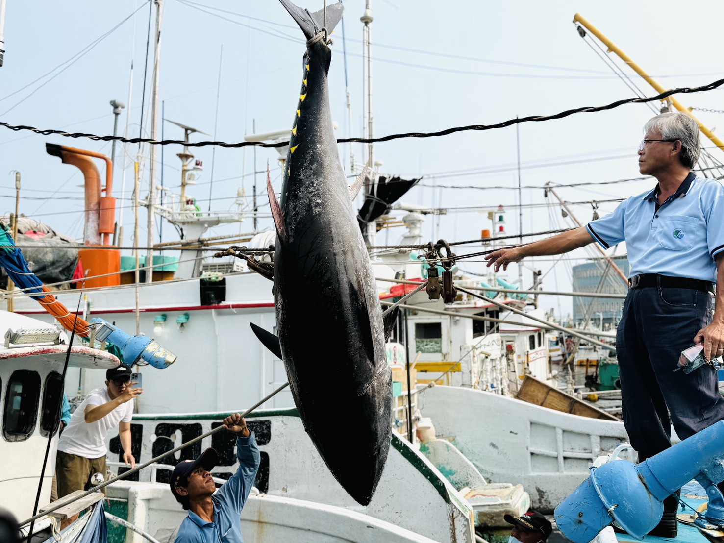 判定是否為活魚起鉤,經確認後,由總幹事鄭鈺宸宣布「富漁慶2號」奪得第一鮪頭采,現場響起熱烈掌聲。