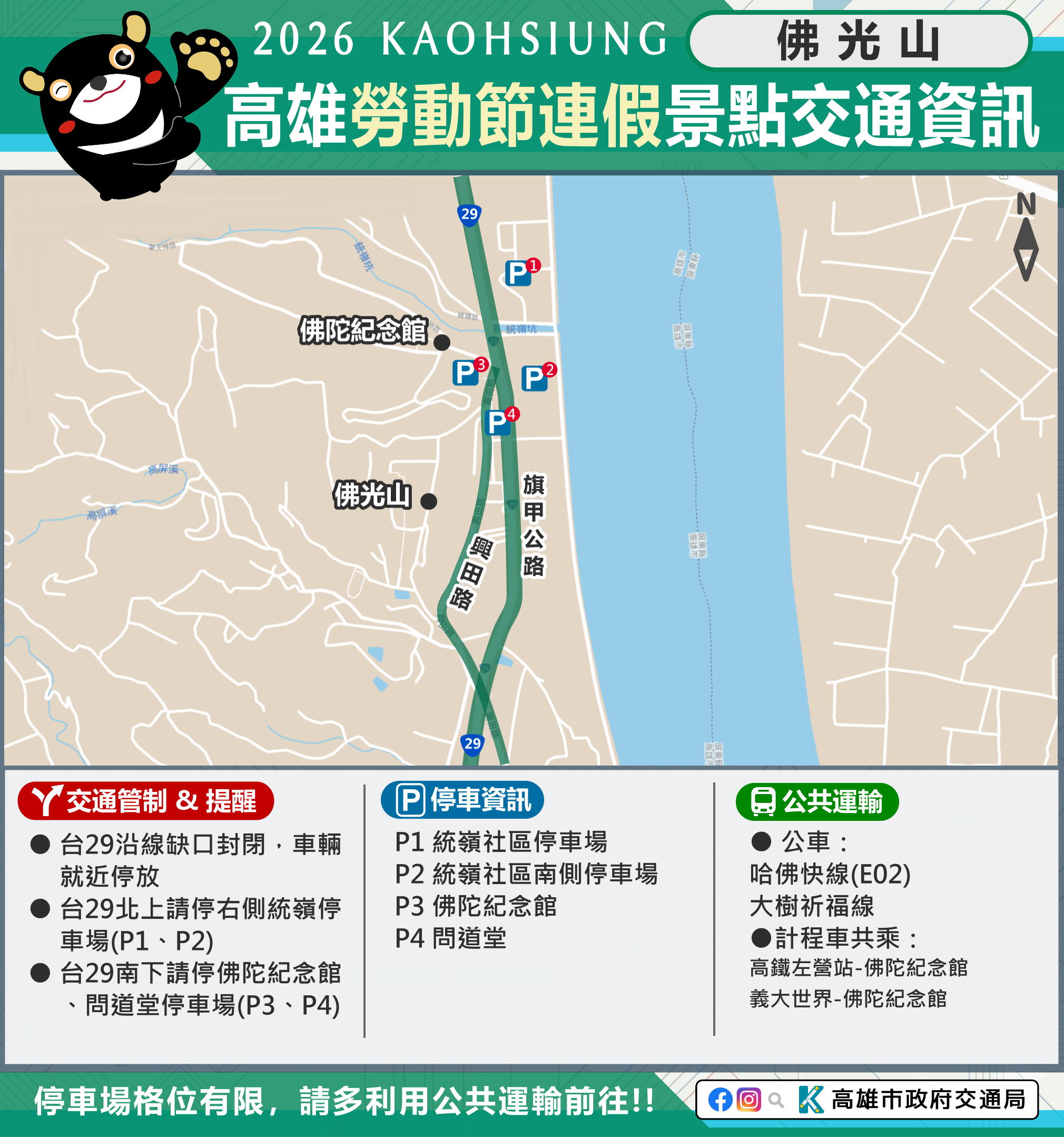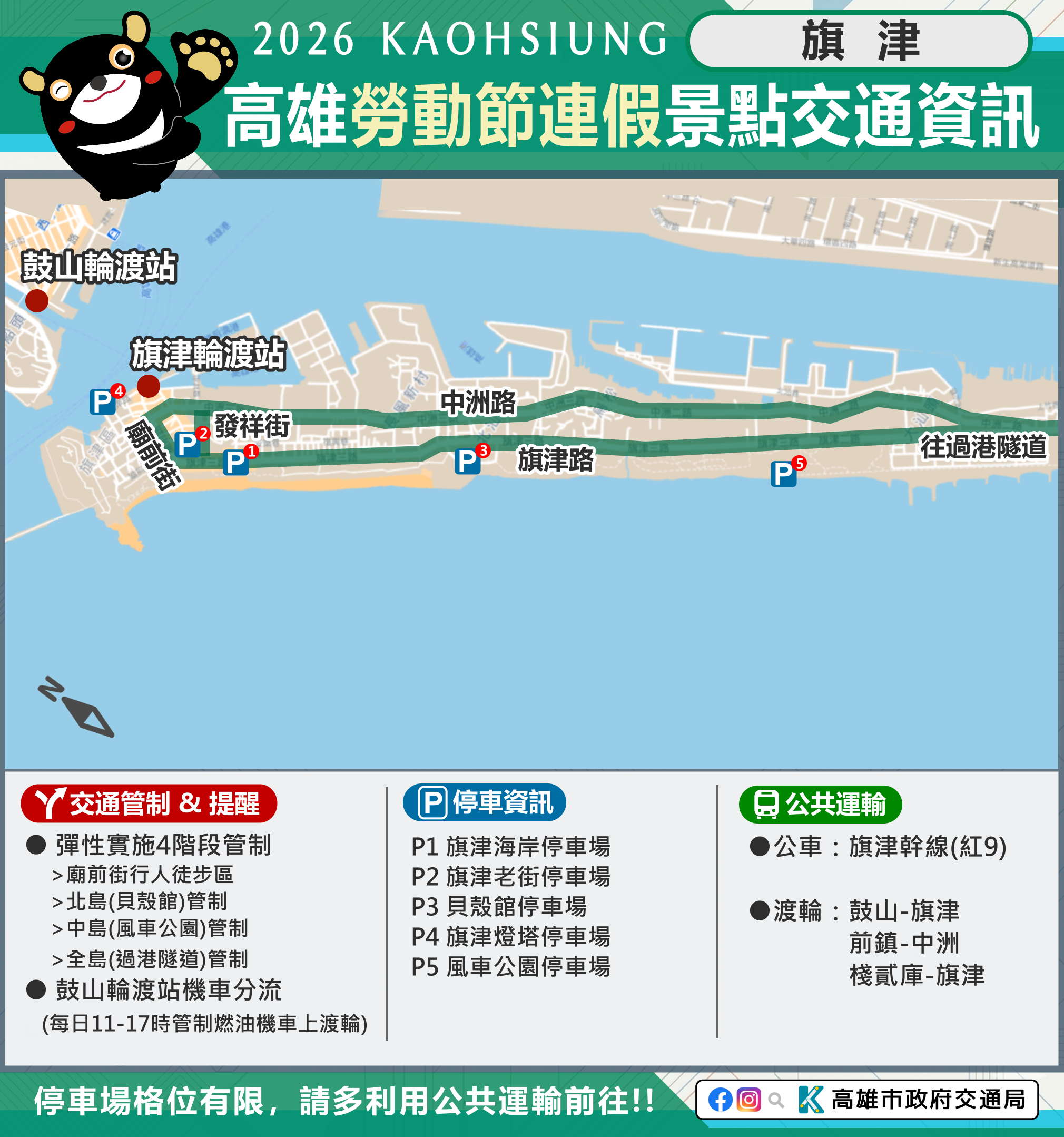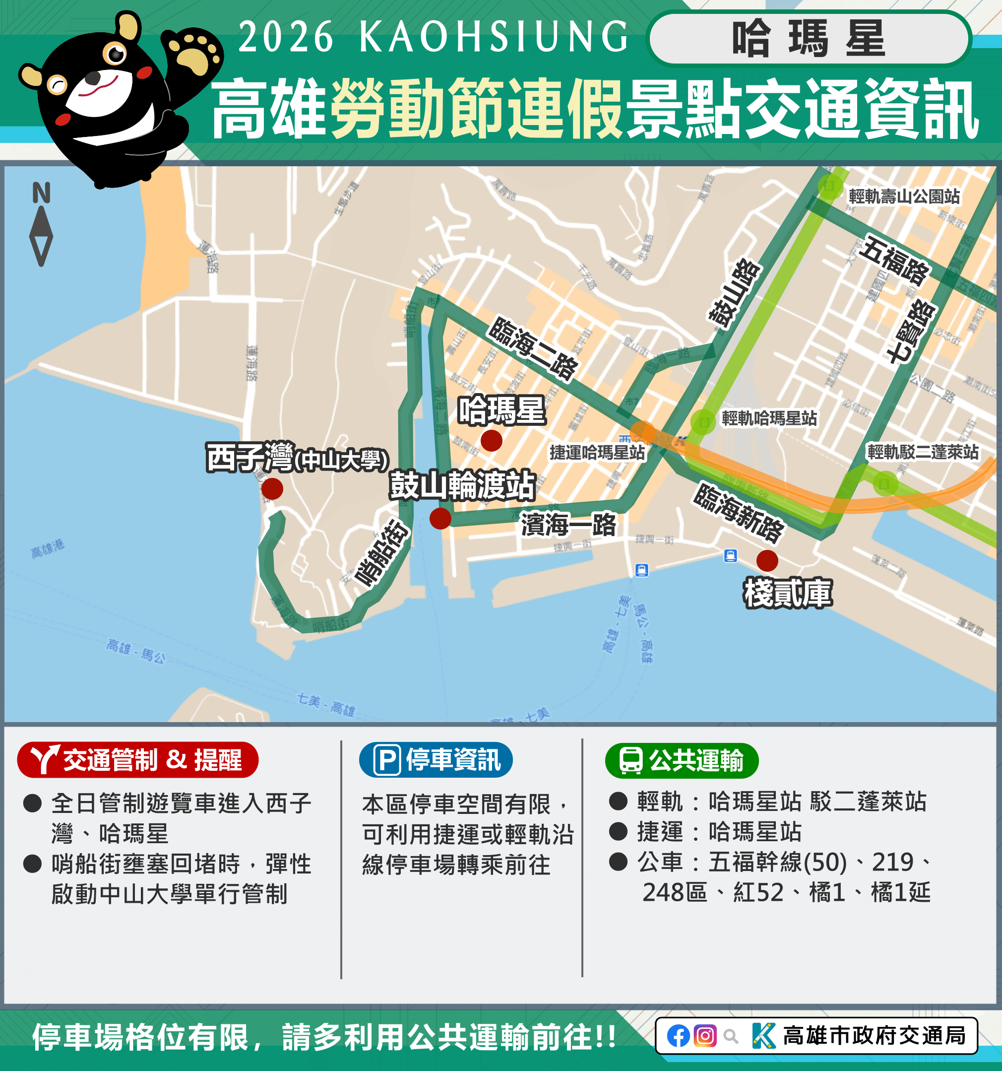 市府相關景點及活動交通管制資訊可至市府Line、臉書、市府交通局( https://www.tbkc.gov.tw/ )、「轉動高雄青春夢」及「高雄旅遊網」等臉書查詢。預祝大家行車平安!