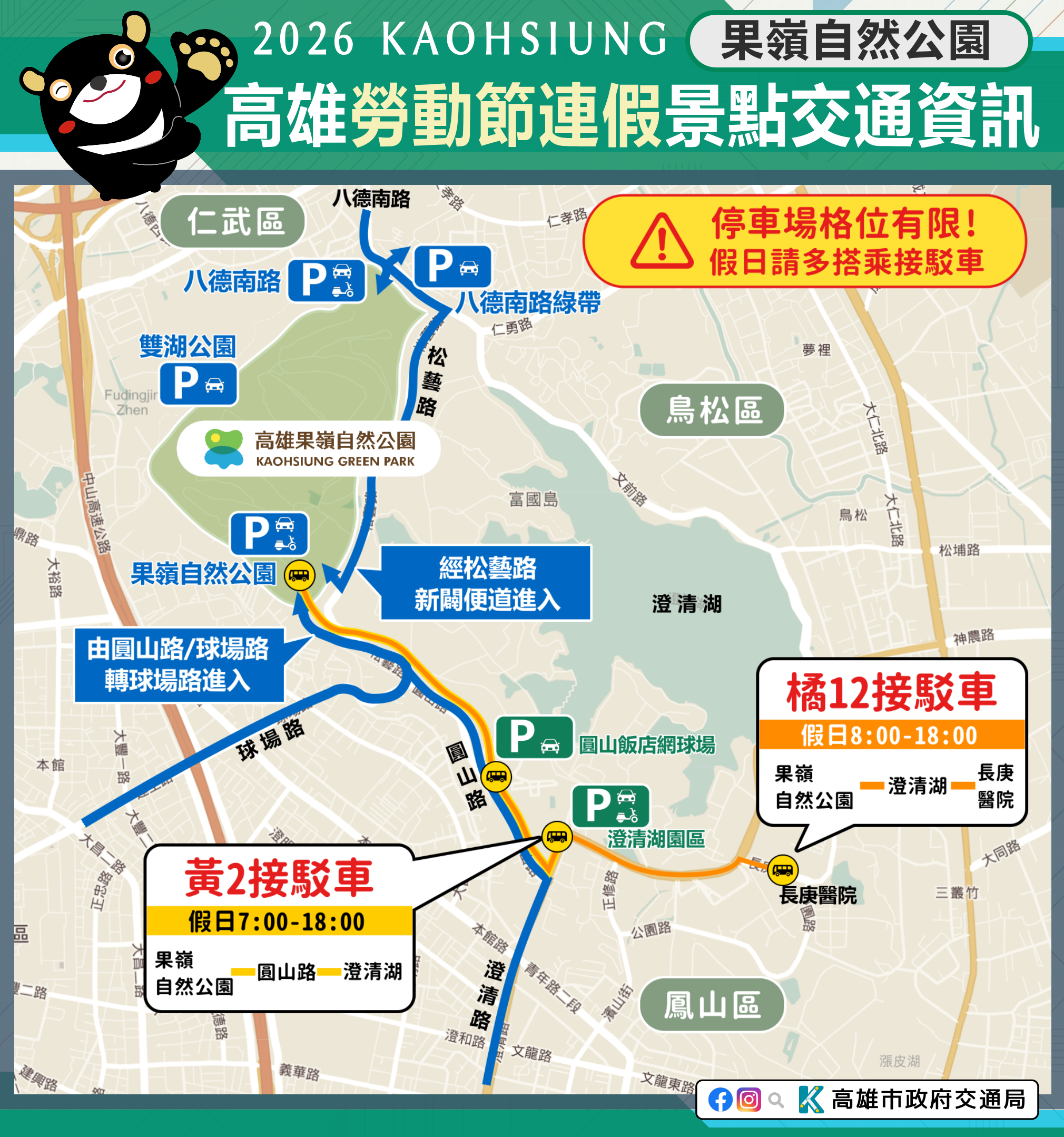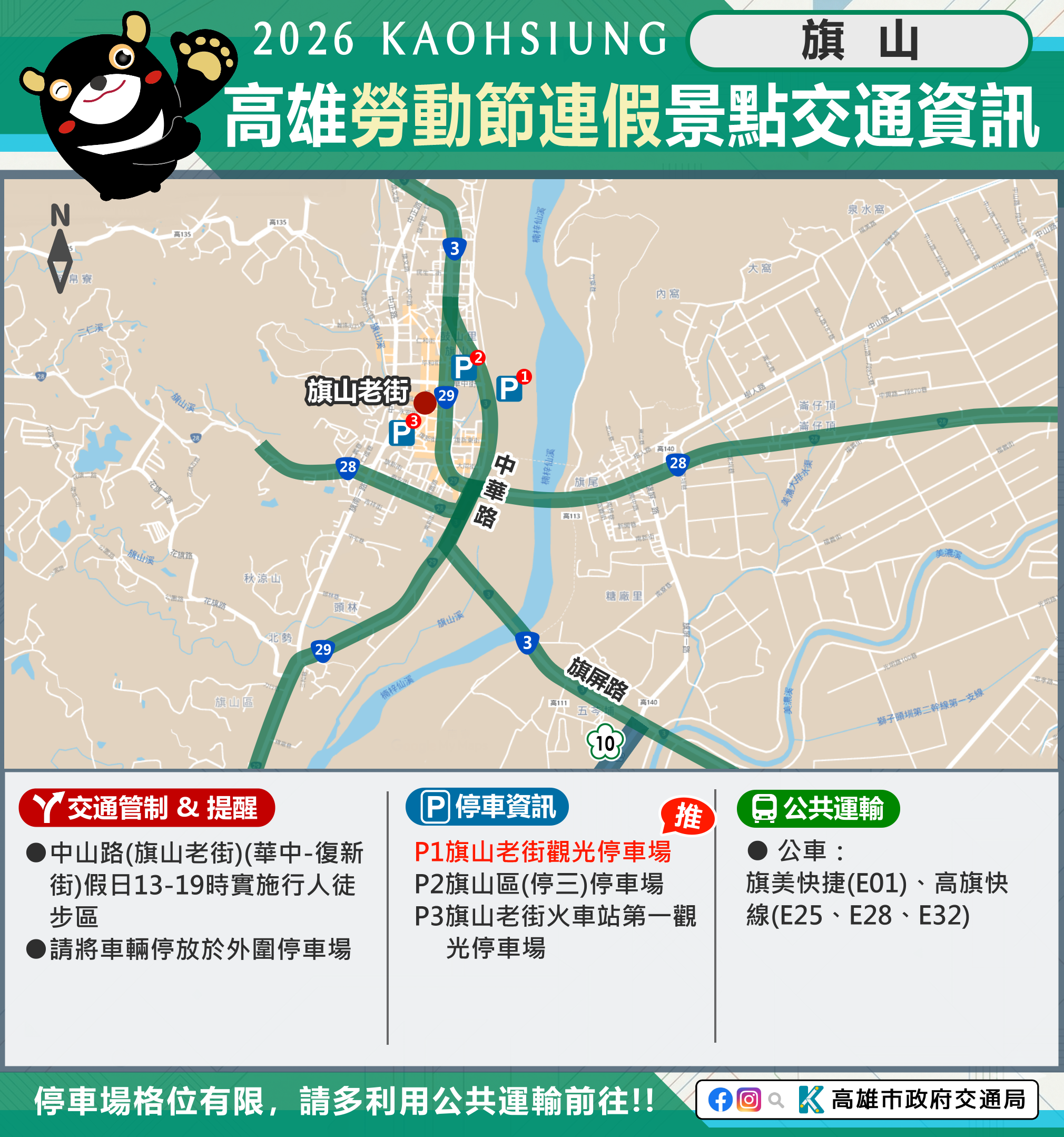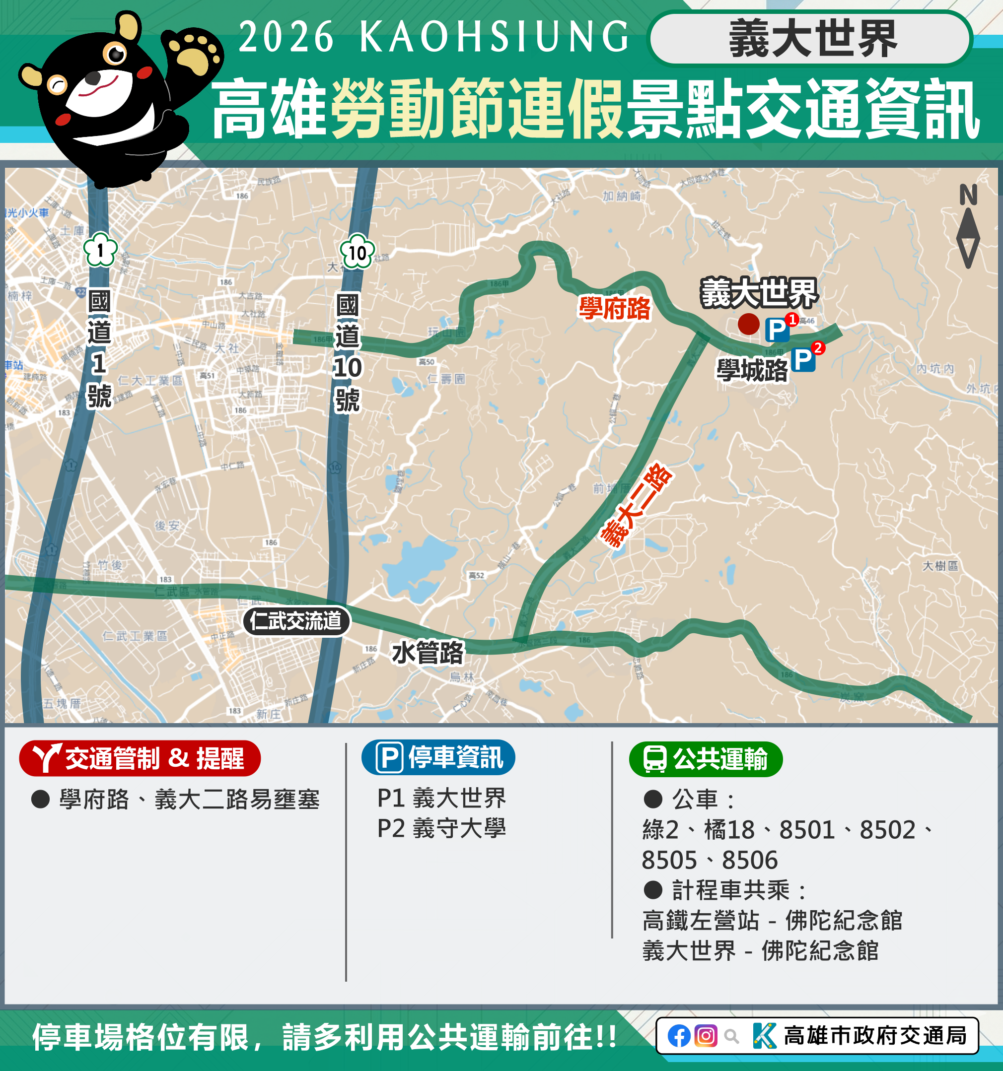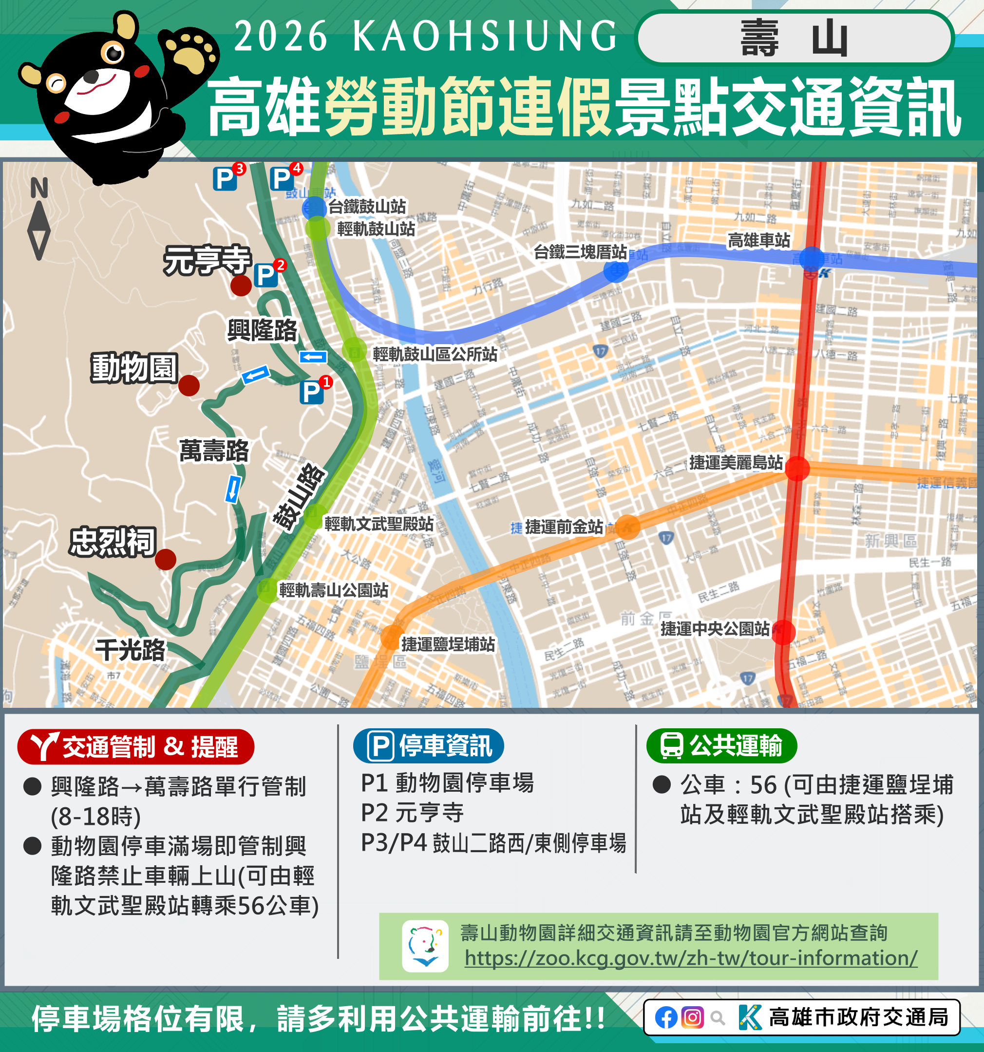 市府相關景點及活動交通管制資訊可至市府Line、臉書、市府交通局( https://www.tbkc.gov.tw/ )、「轉動高雄青春夢」及「高雄旅遊網」等臉書查詢。預祝大家行車平安!