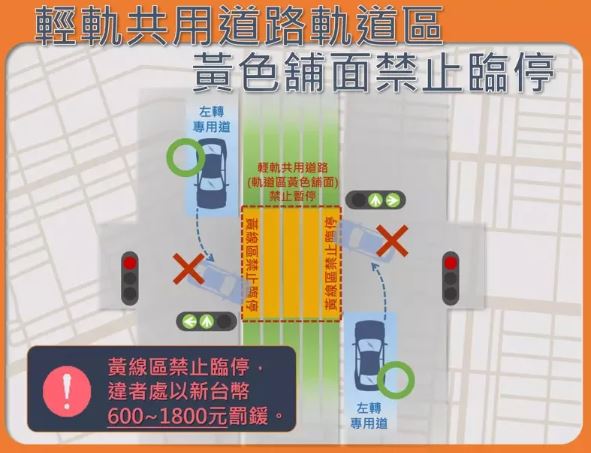 捷運局說,用路人如果違規在輕軌共用道路路口軌道黃色舖面區臨停等待左轉,警方將依違反道路交通管理處罰條例第48條第二款規定,駕駛人轉彎時,不依標誌、標線、號誌指示,處新臺幣600元以上1800元以下罰鍰。