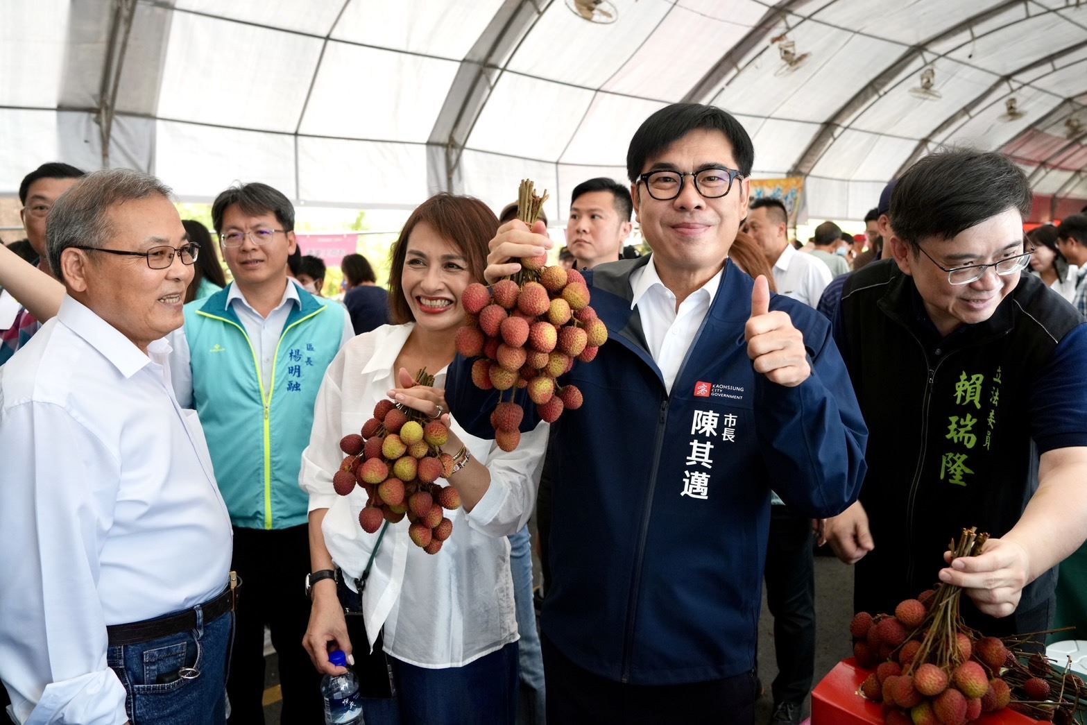 市長陳其邁在開幕式上熱情推銷大樹玉荷包荔枝及金鑽鳳梨,讚賞它們的美味可口和養顏美容功效,更提及這些好品質的水果已經成功外銷到多個國家,期許明年的豐收。