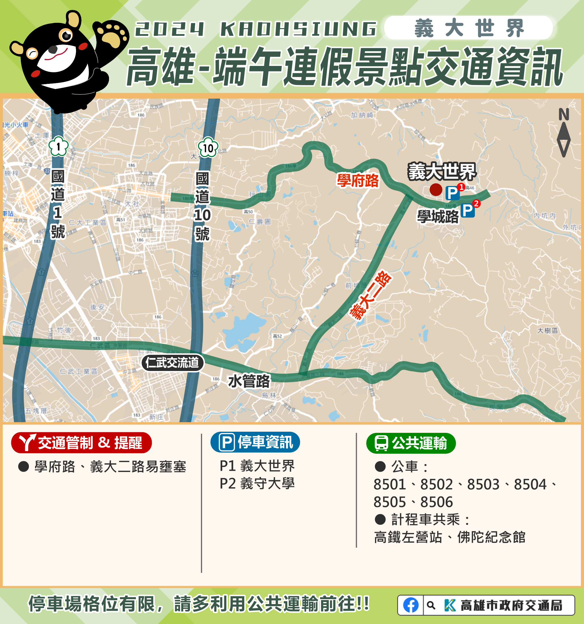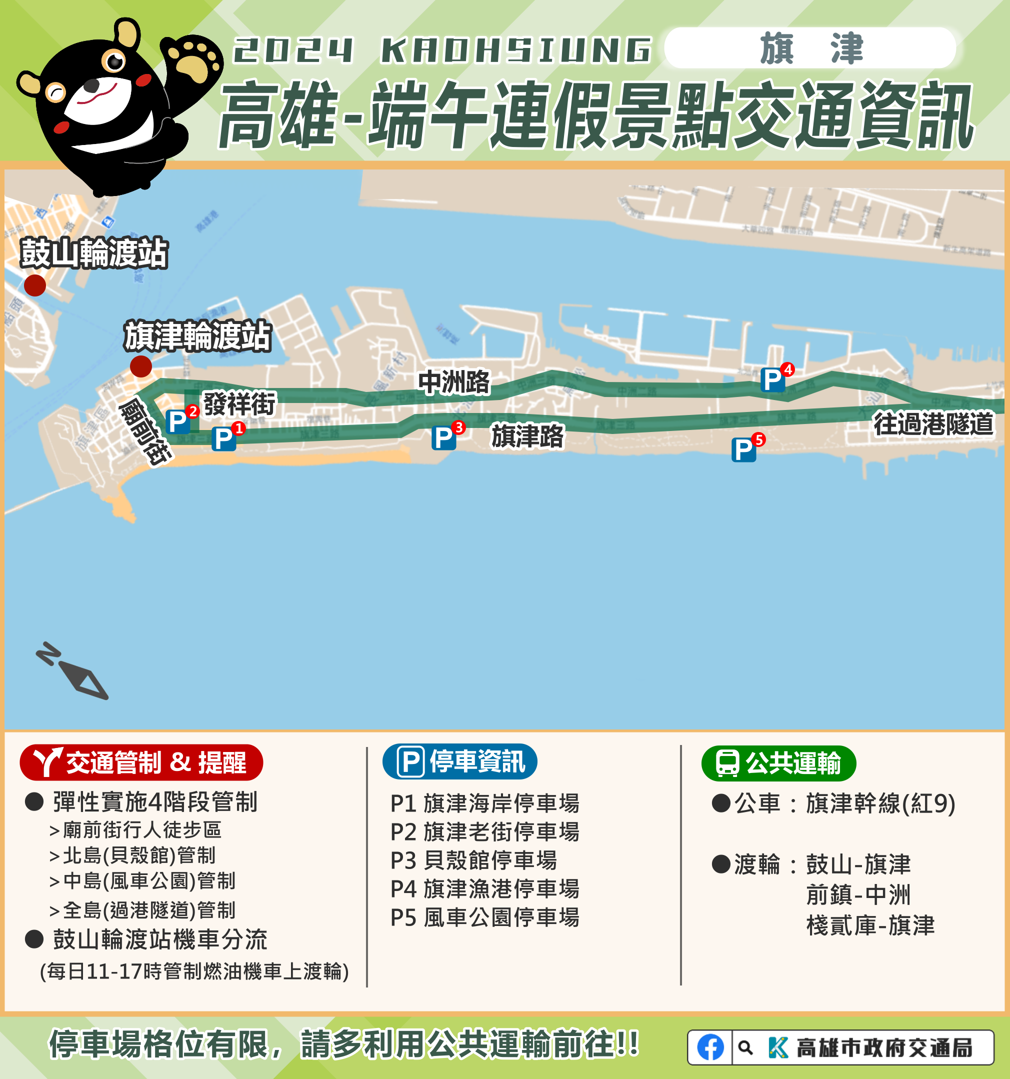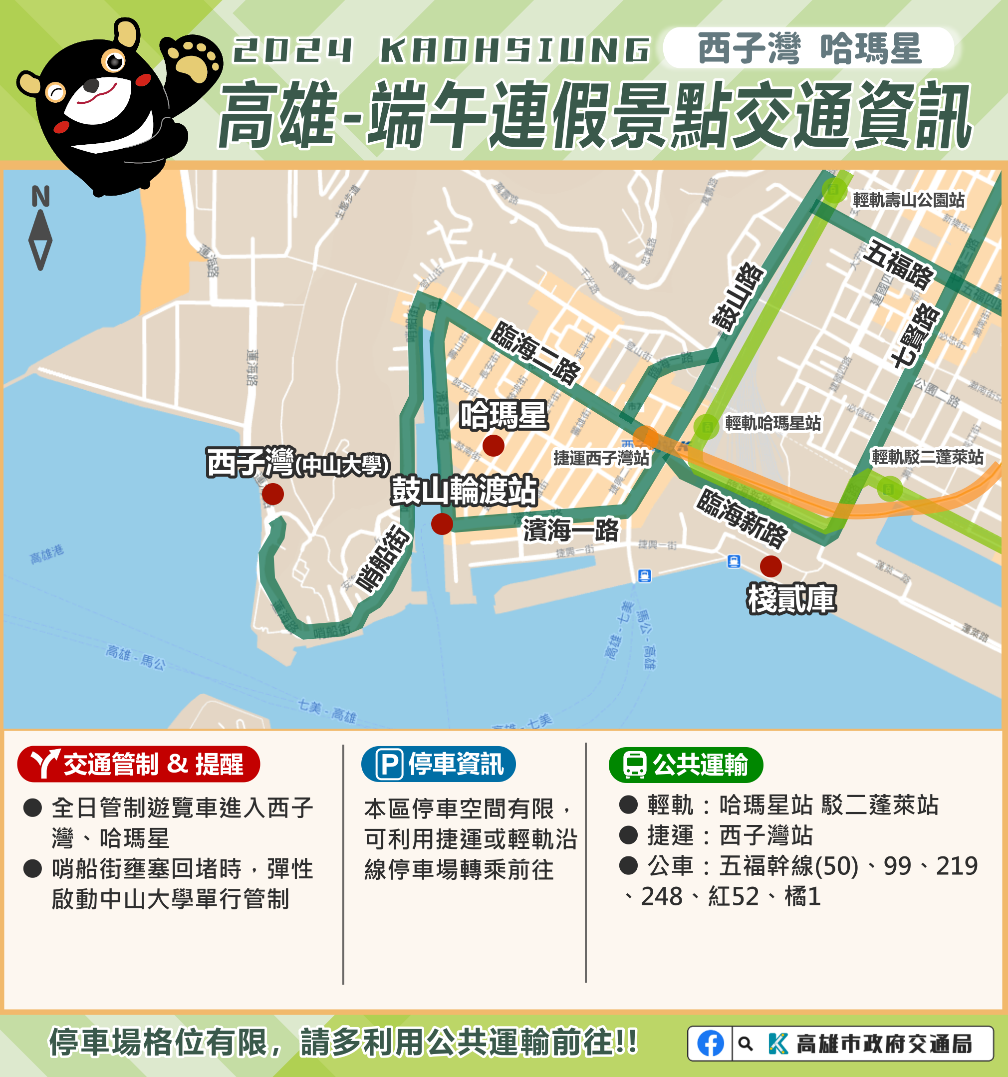 相關景點及活動交通管制資訊可至市府Line、臉書、市府交通局(https://www.tbkc.gov.tw/)、「轉動高雄青春夢」及「高雄旅遊網」等臉書查詢。