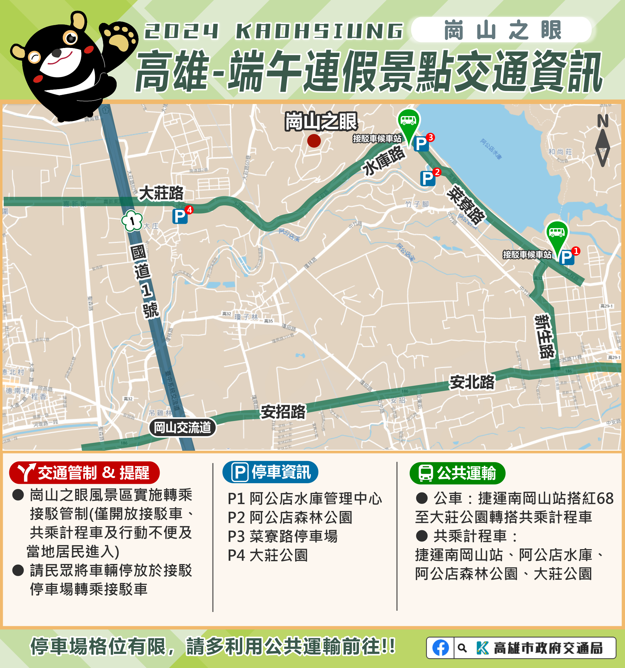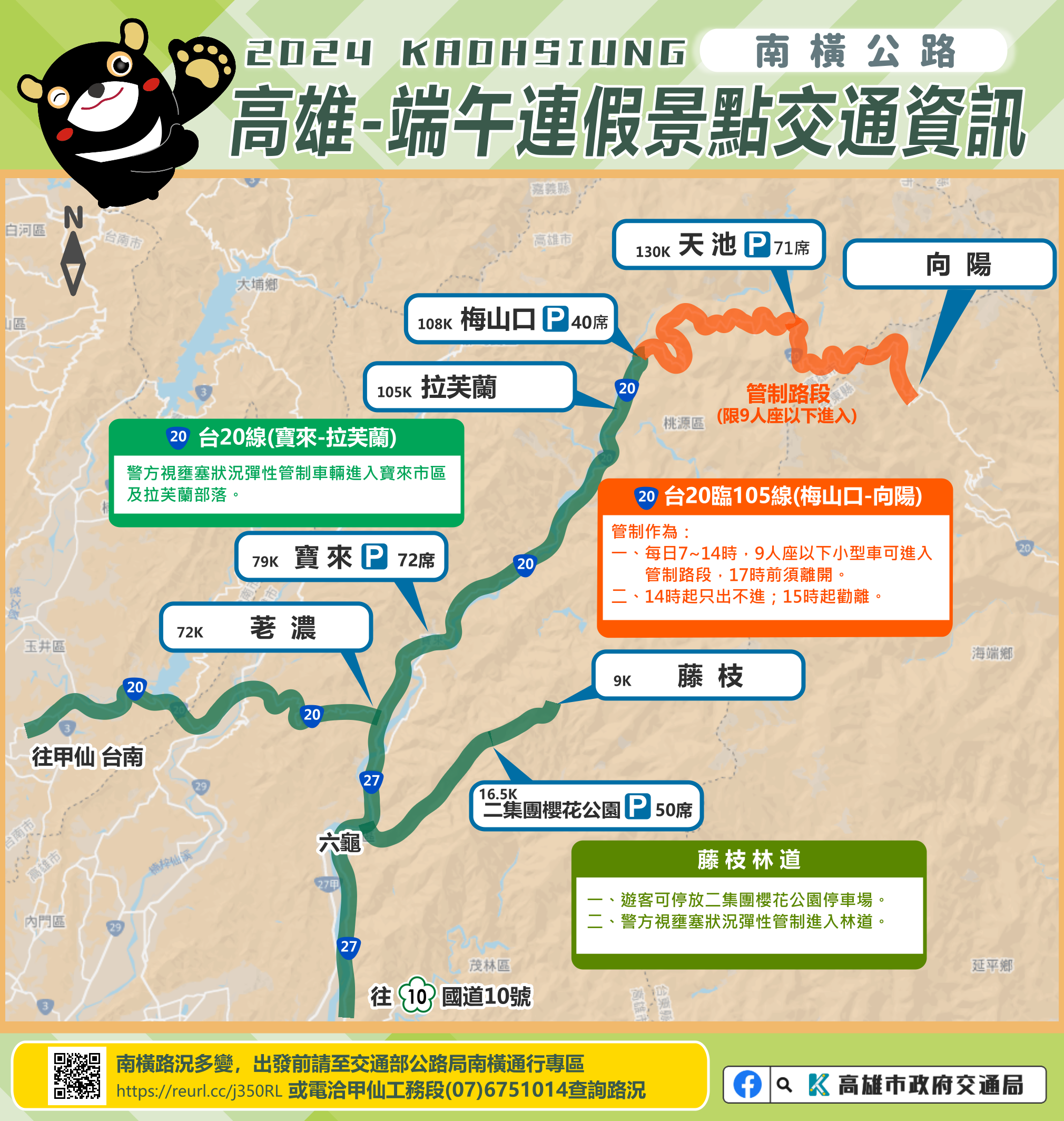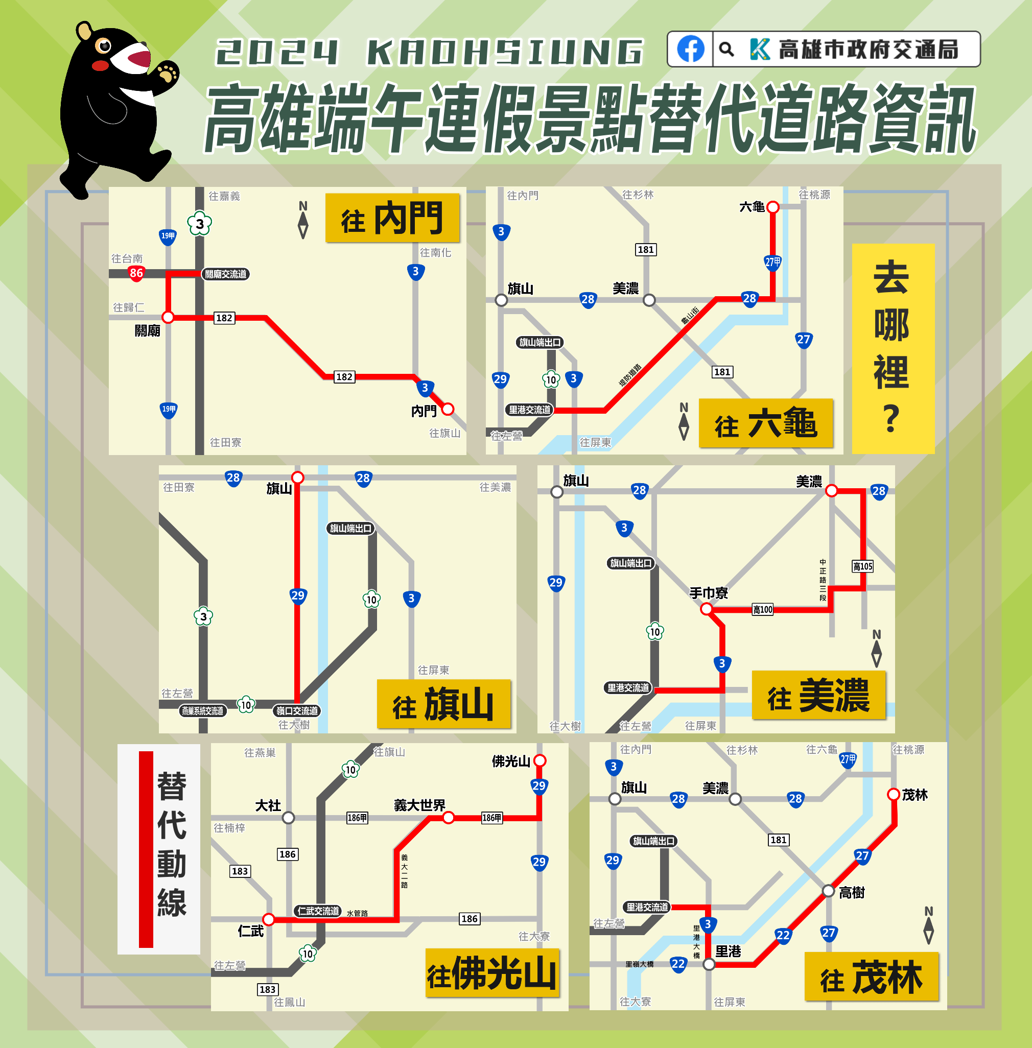 出門前可多利用高雄市即時交通資訊網(https://traffic.tbkc.gov.tw)、省道即時交通資訊網等查詢即時交通路況,並適時行駛替代道路。