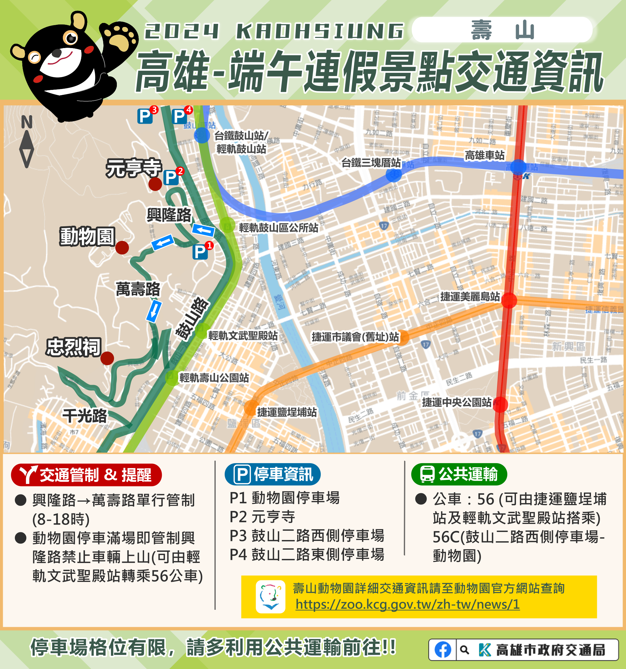 呼籲遊客可於捷運鹽埕埔站、輕軌文武聖殿站轉乘56號公車前往動物園,詳細交通資訊請至壽山動物園臉書或網站(https://zoo.kcg.gov.tw/zh-tw/news/1)查詢。