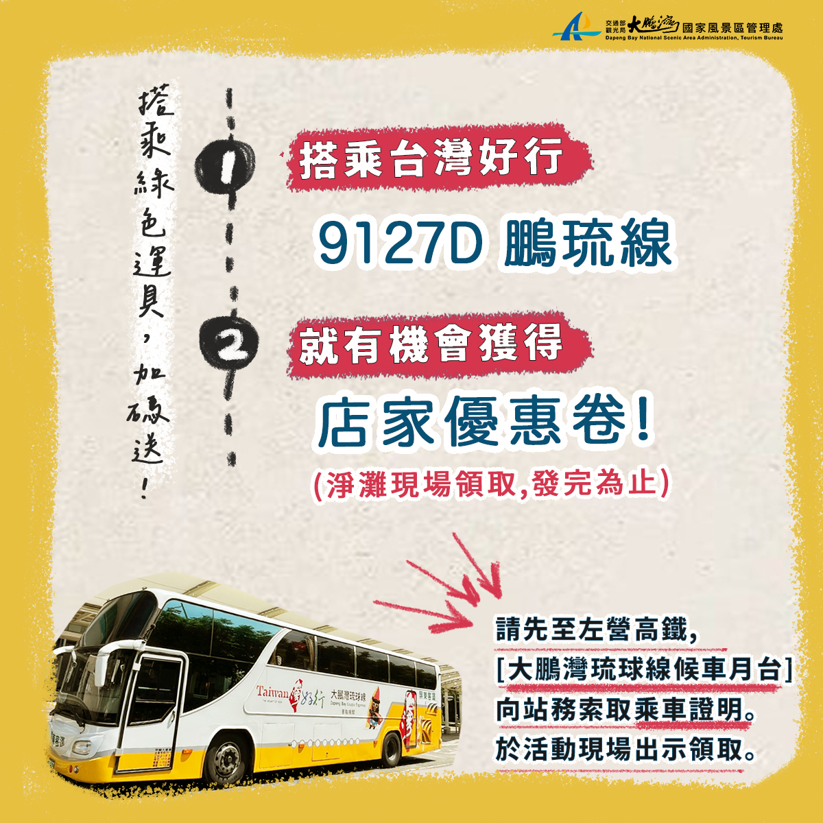 另外,鵬管處特別提到愛龜淨灘也是交通部觀光局「2023台灣仲夏旅遊節」系列活動之一,所以再加碼,為鼓勵搭乘大眾運輸,參與淨灘者若搭乘台灣好行大鵬灣琉球線,從高鐵左營到東港,並出示乘車證明,還可獲得100元折價券,同時可在合作店家消費使用。