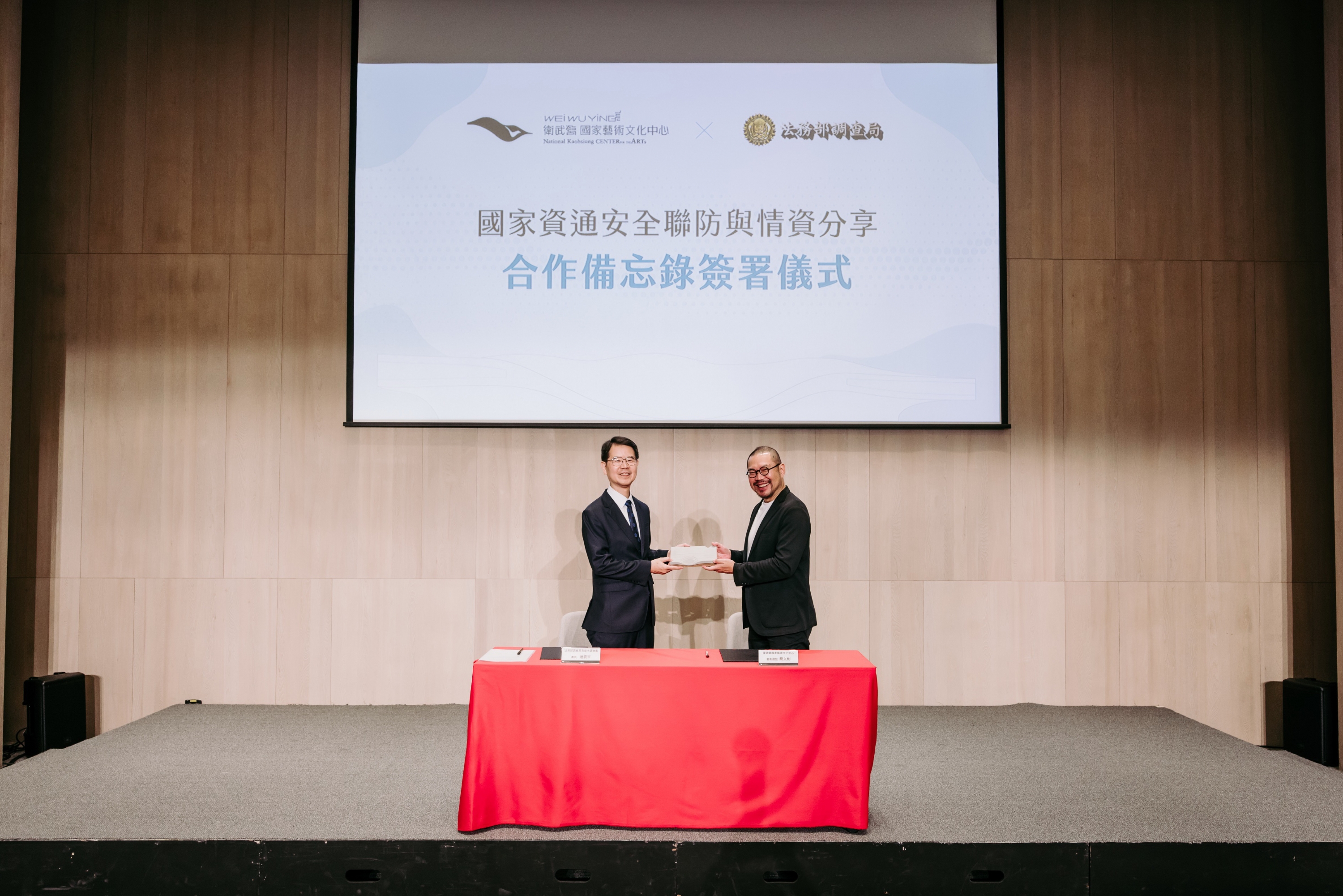 在簽署儀式上,衛武營藝術總監簡文彬與高雄市調查處處長連震宗共同簽署合作備忘錄。