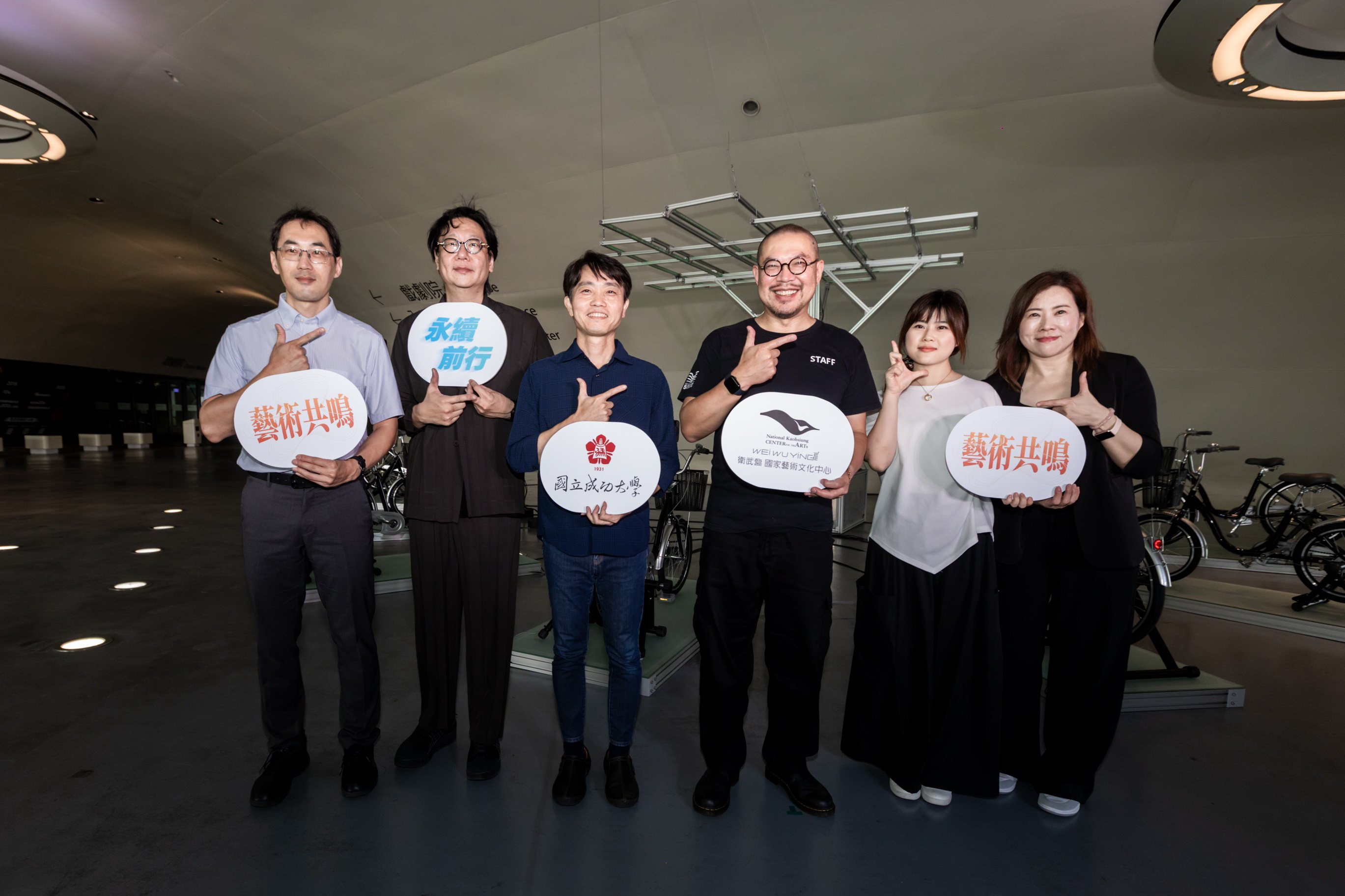 ( (左起)成功大學規劃與設計學院 副院長 蔡耀賢、成功大學科技藝術碩士學位學程副主任 林軒丞、成功大學藝術中心藝術長 馬敏元、