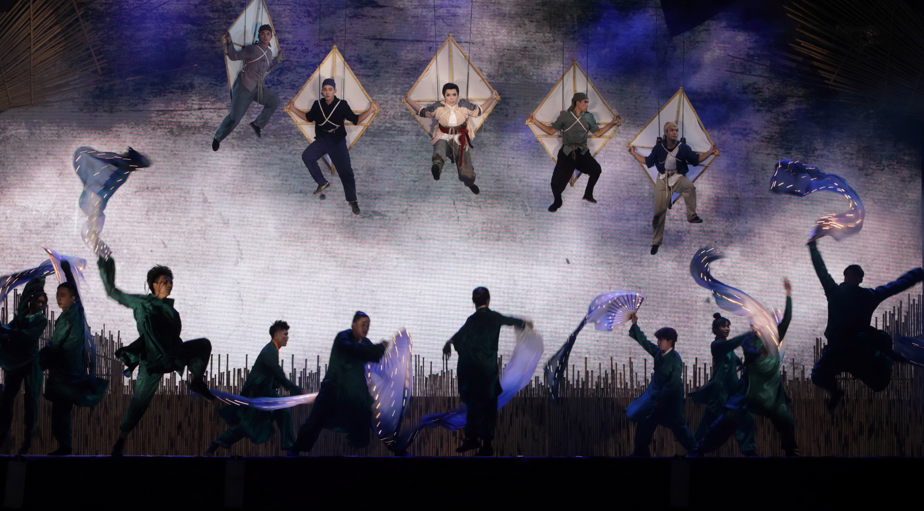 演員綁搭大型風箏飛越城牆,場面驚心動魄,觀眾直呼精彩。