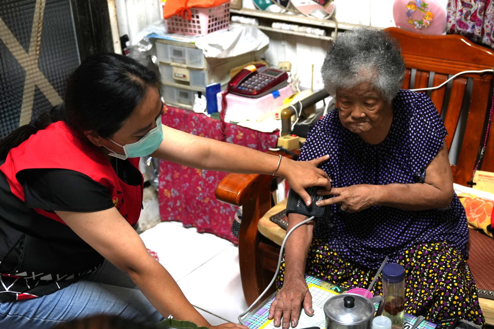 照服員不僅傾聽,更貼心地為他測量血壓、叮囑健康管理,宛如家人般的陪伴,讓孤單的夜晚多了一份溫度。