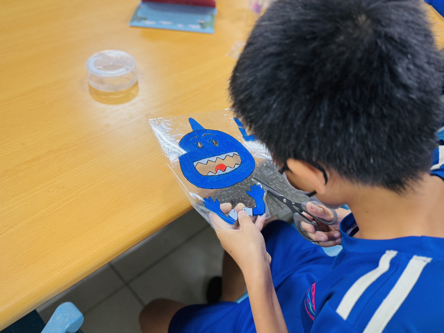 再一步步引導他們描繪、剪影、上色、組裝、操偶。