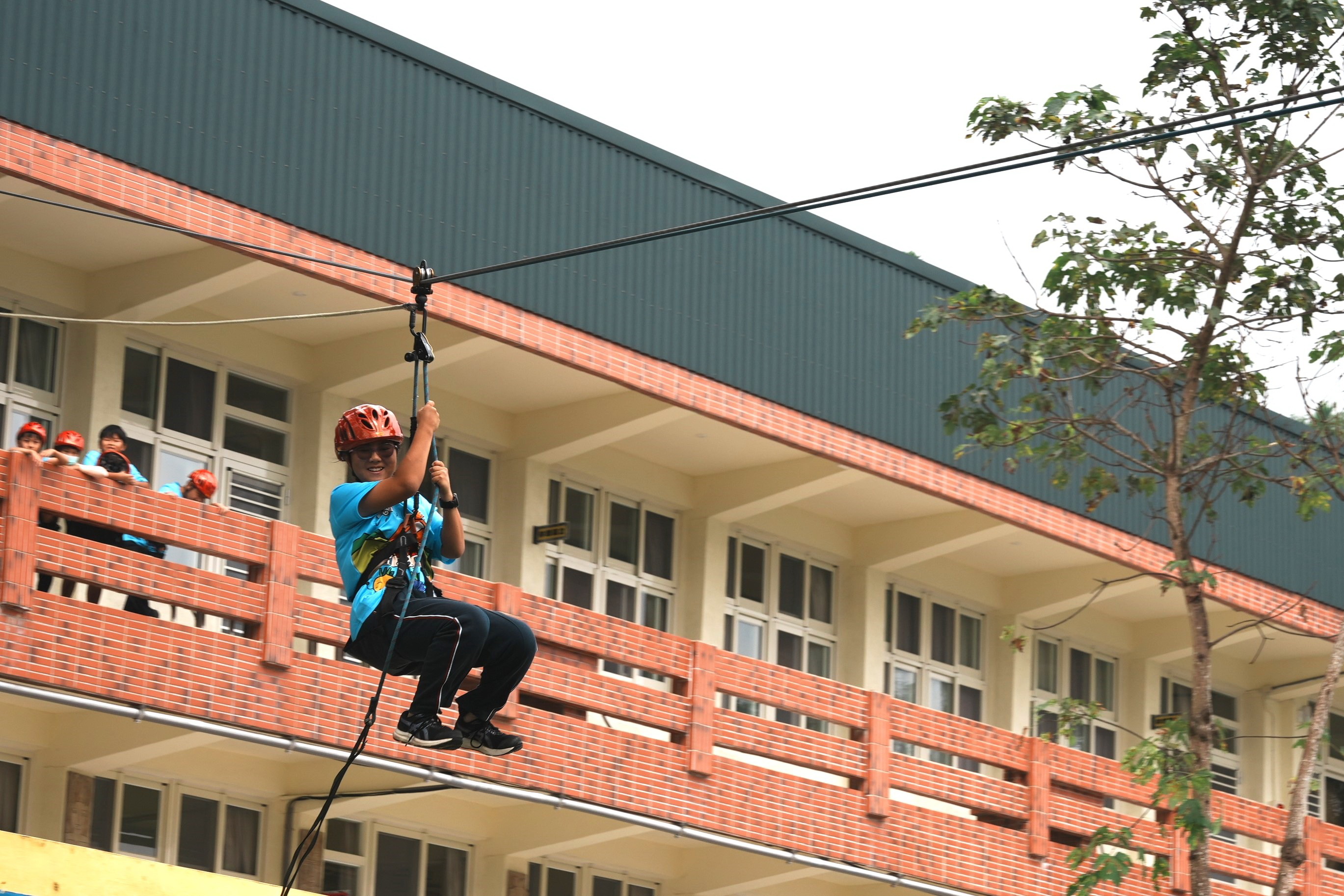 在專業教練指導下,學生挑戰高空滑降、攀上2、3層樓高的樹冠,從一開始的害怕到想再體驗一次。