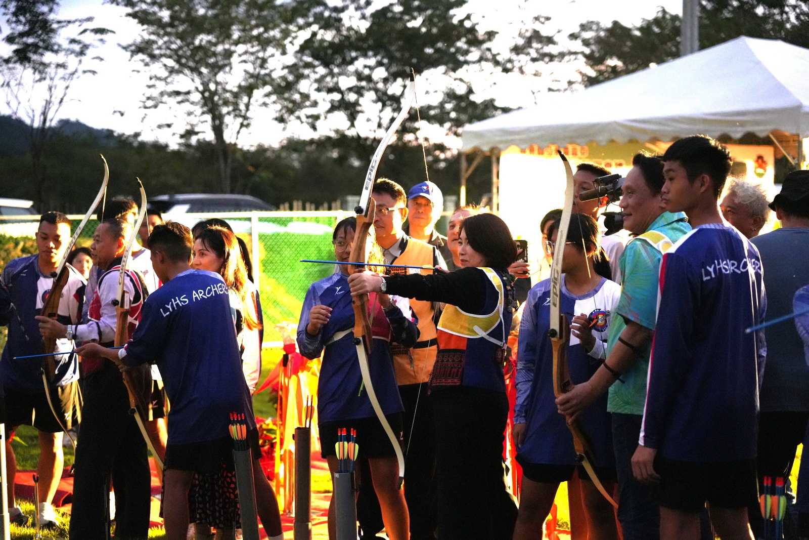 並在射箭隊同學的指導下,拉弓、瞄準、放箭,正式啟用射箭場。