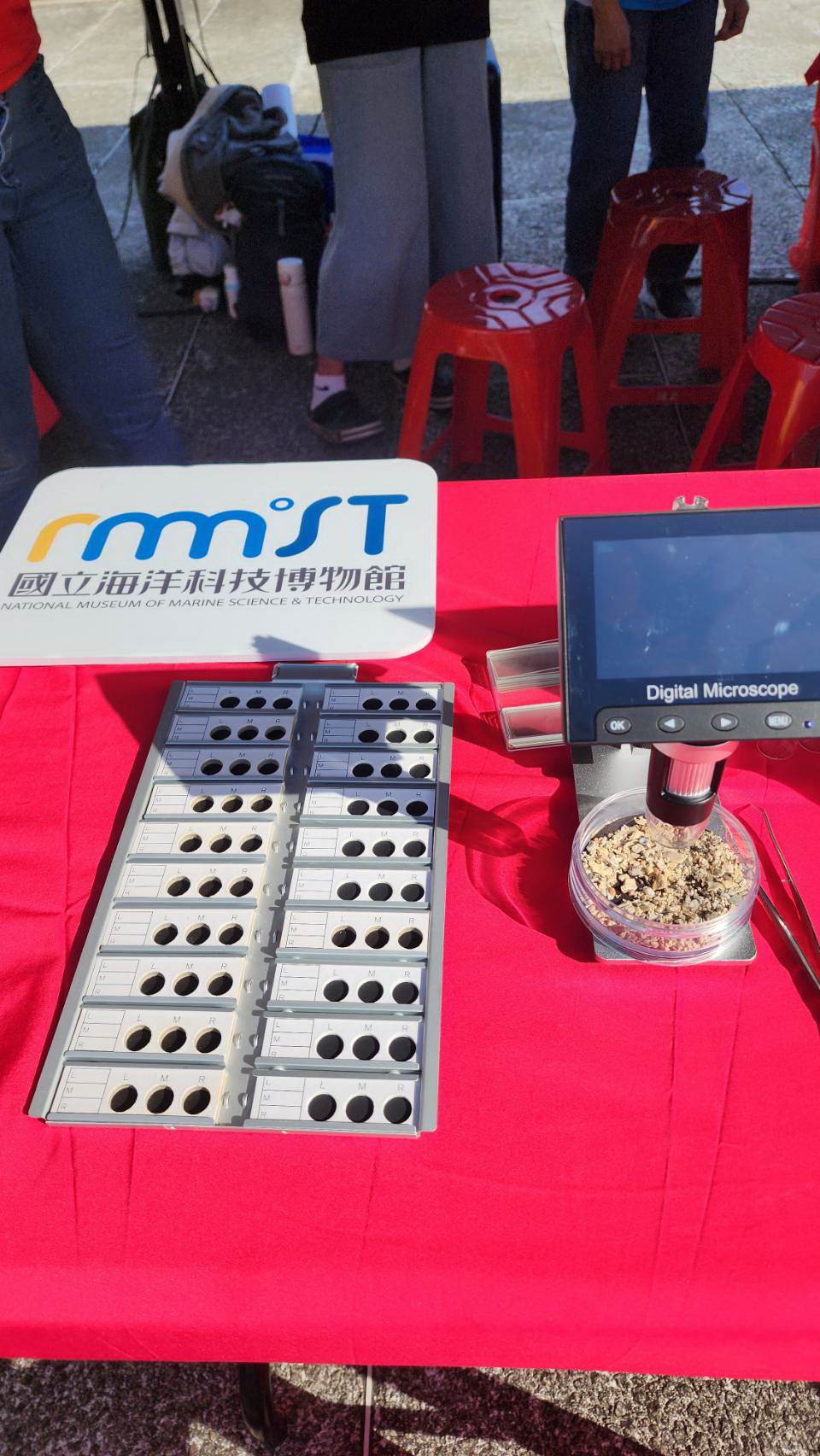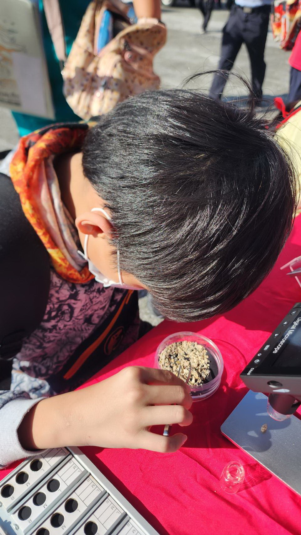 活動現場,小朋友與家長透過顯微鏡及鑷子細細挑選,淺盤中的每一抔砂都可能發現驚喜。