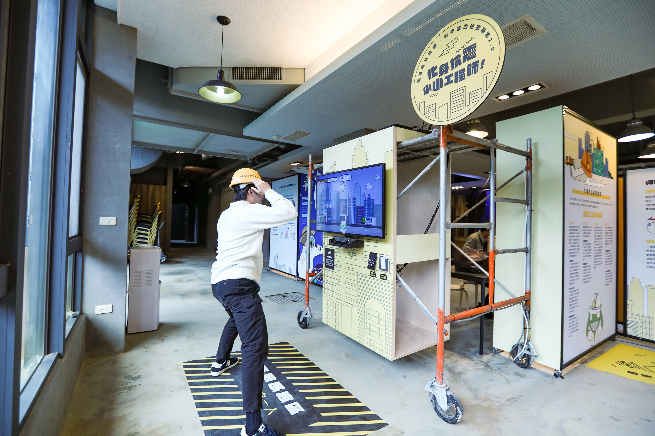 先透過淺顯易懂的動畫認識隔減震工程原理,之後進行體感互動,左右移動身體來承接正確的隔減震元件。